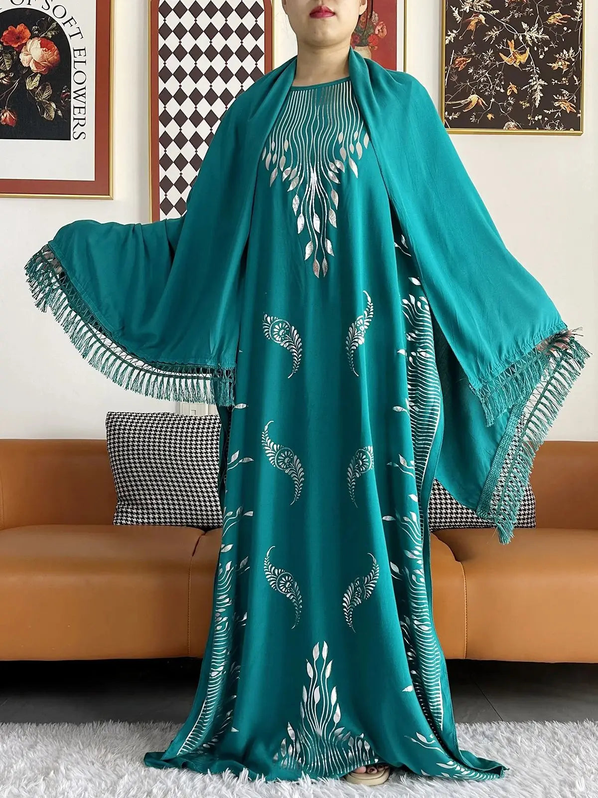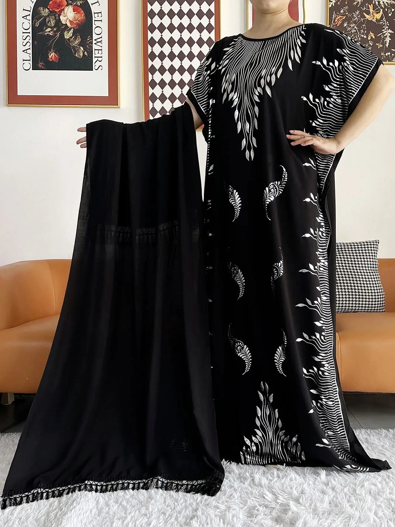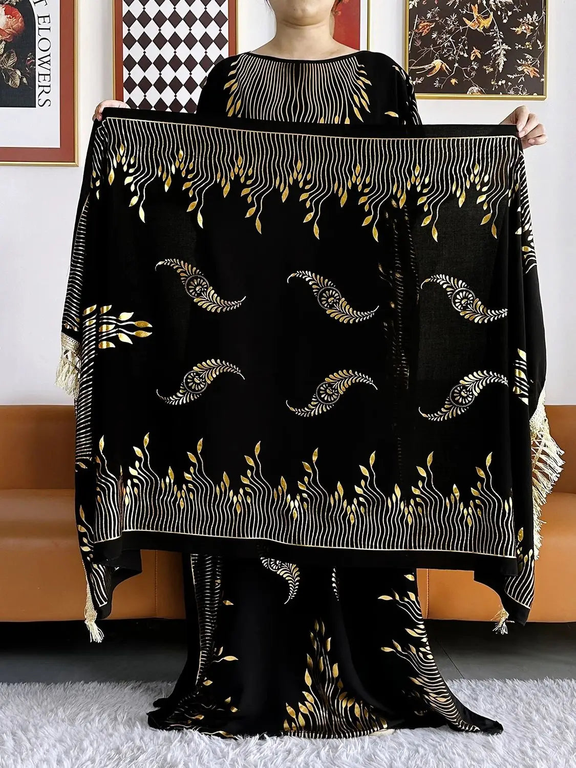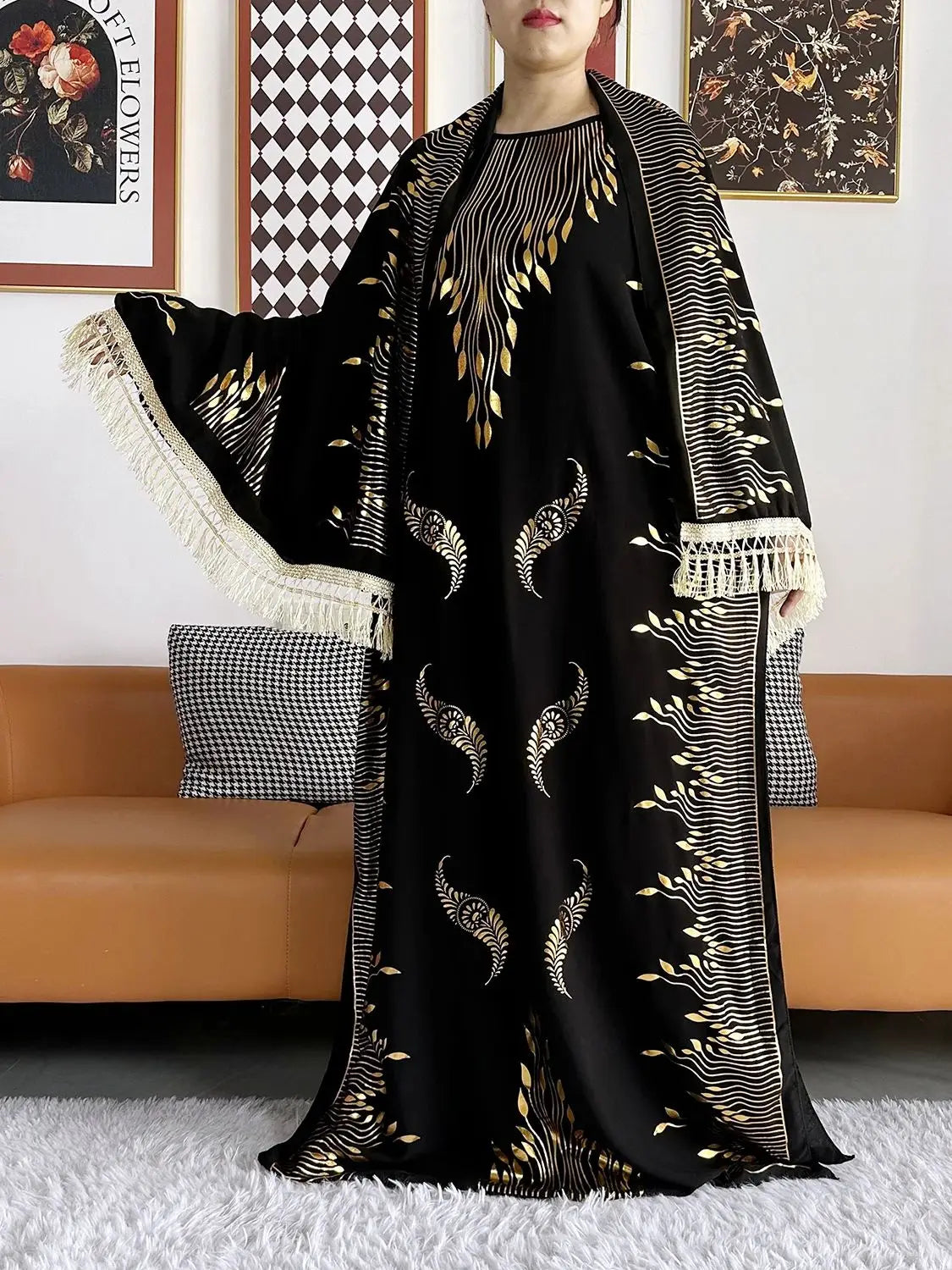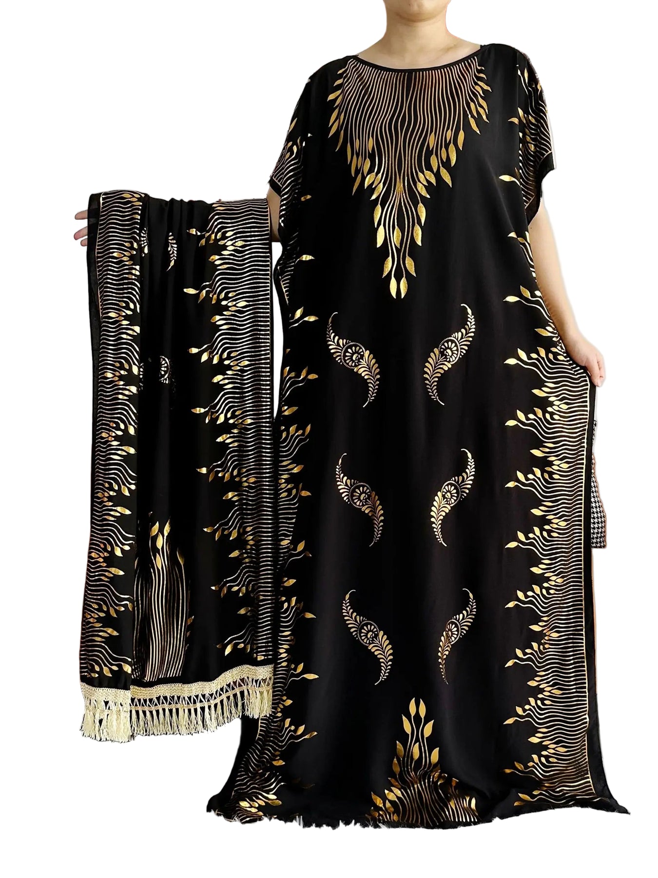 Luftig och elegant abaya för kvinnor, perfekt för sommar. Tillverkad i mjuk bomull med kort ärm, dekorativa guldfärgade tryck och tofsdetaljer. Levereras med stor matchande sjal, passar både vardag och festliga tillfällen.