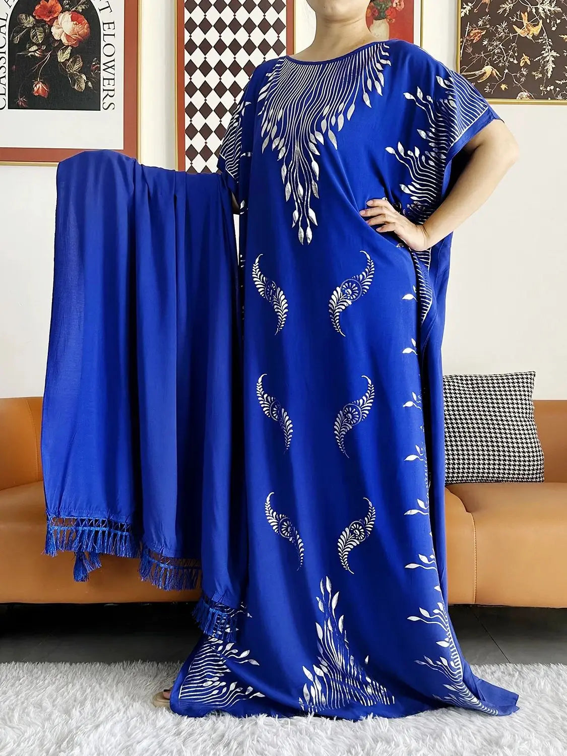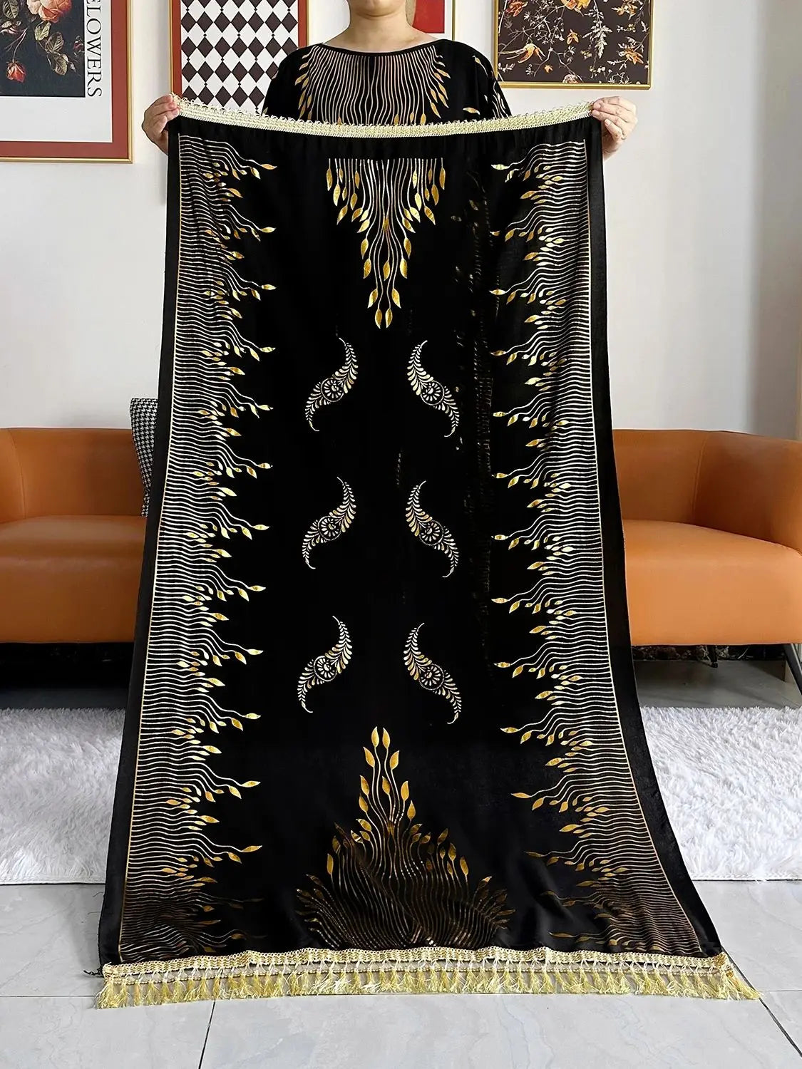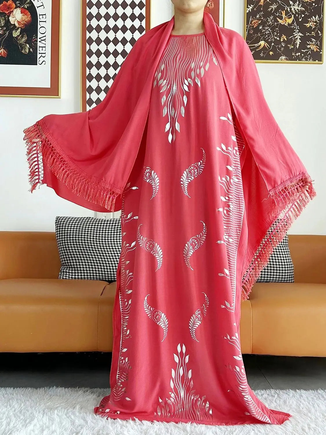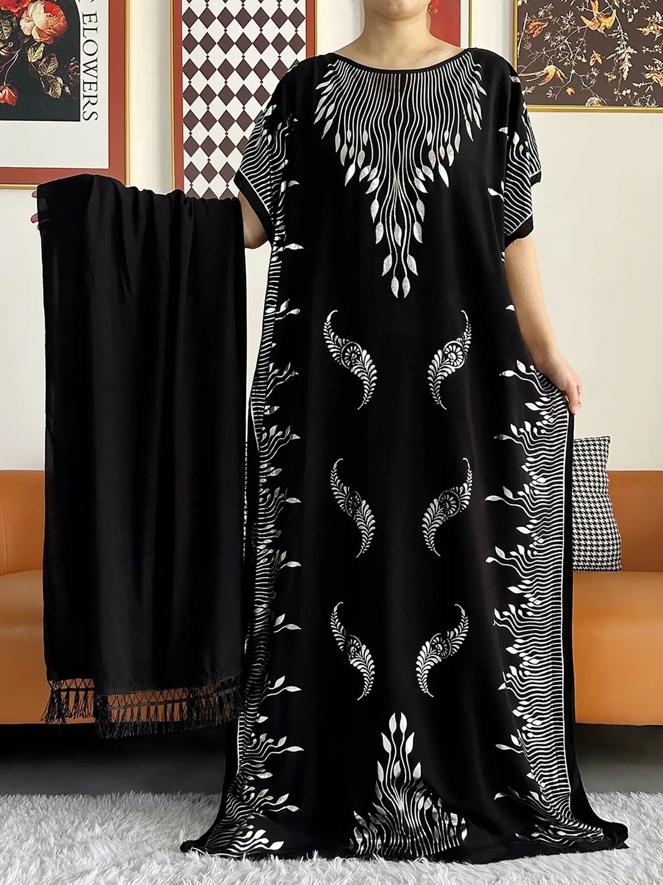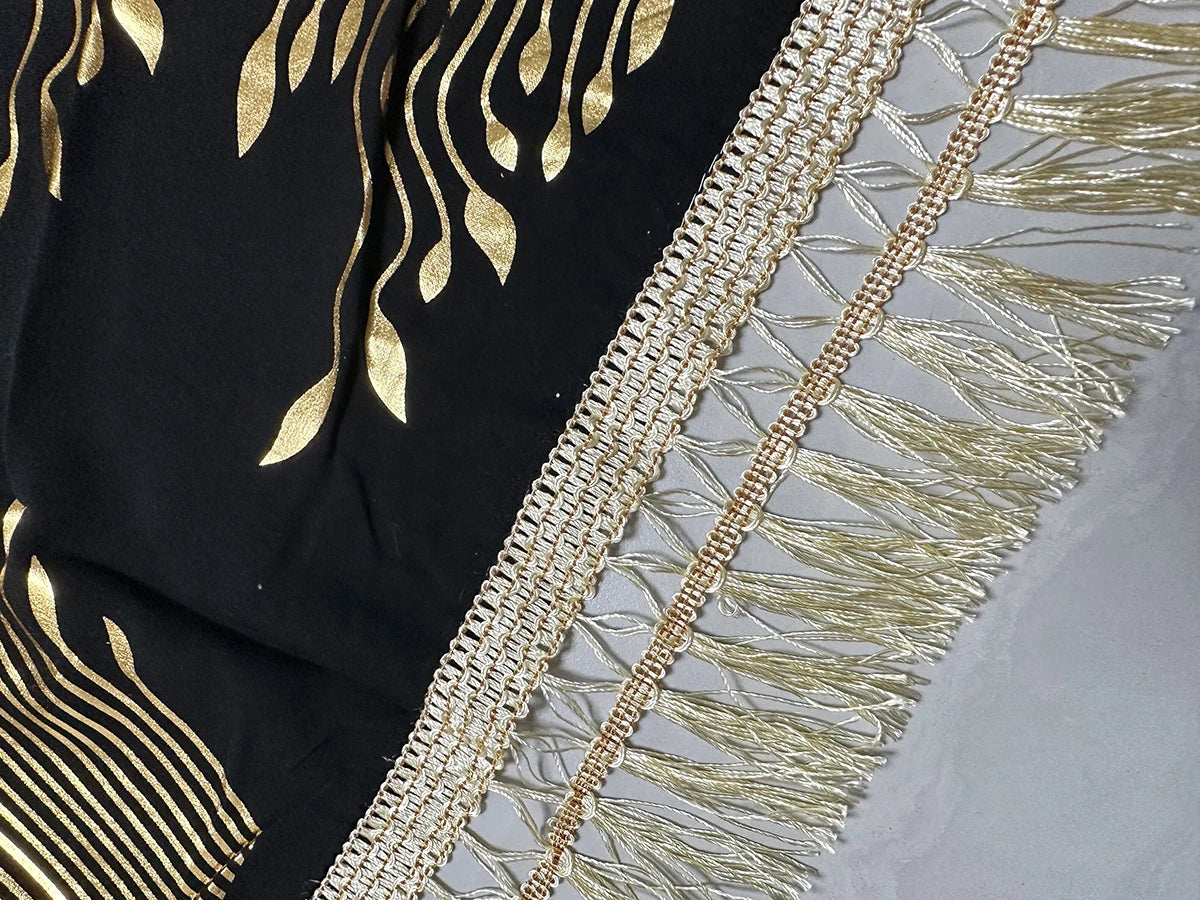 Luftig och elegant abaya för kvinnor, perfekt för sommar. Tillverkad i mjuk bomull med kort ärm, dekorativa guldfärgade tryck och tofsdetaljer. Levereras med stor matchande sjal, passar både vardag och festliga tillfällen.
