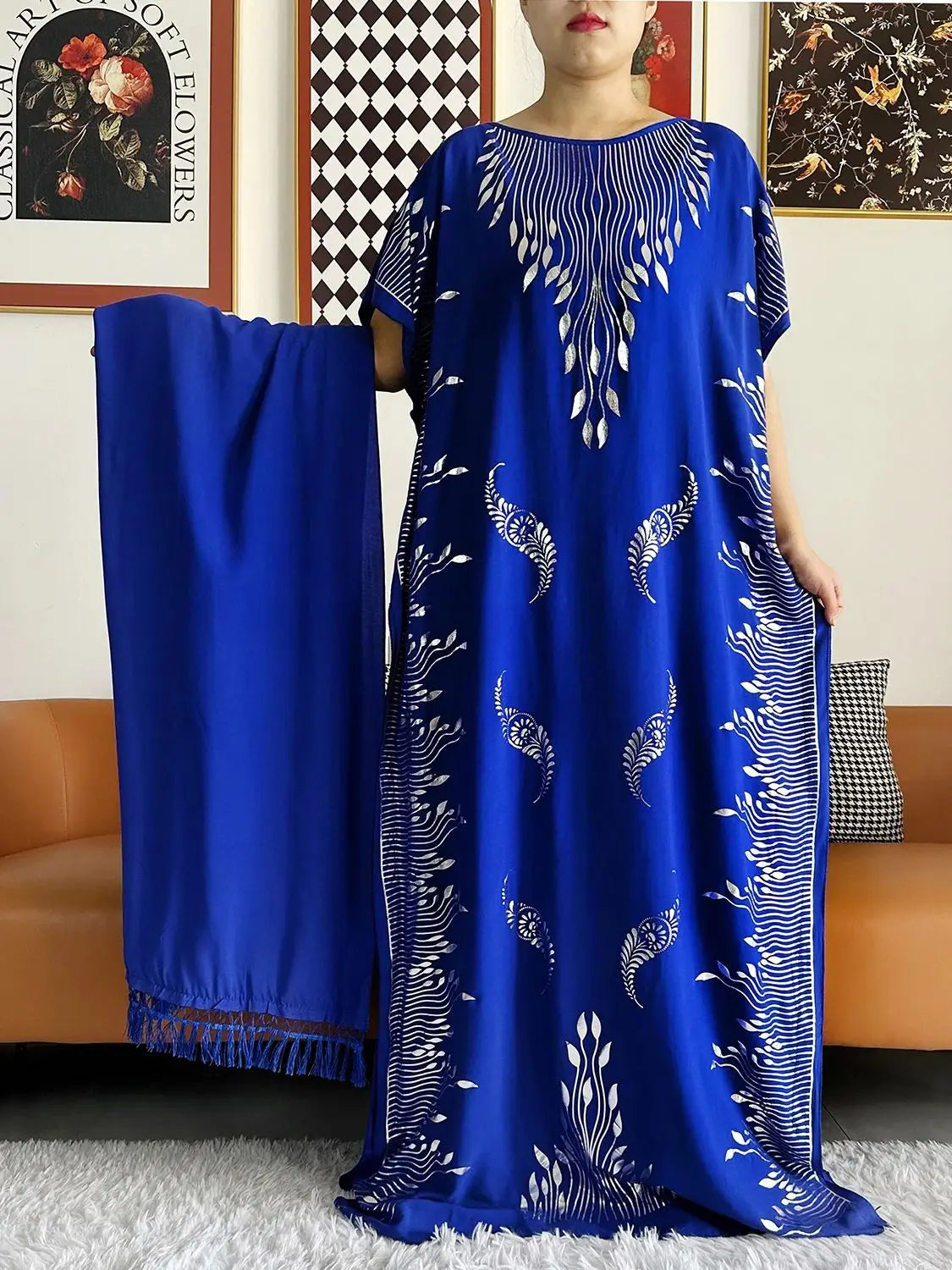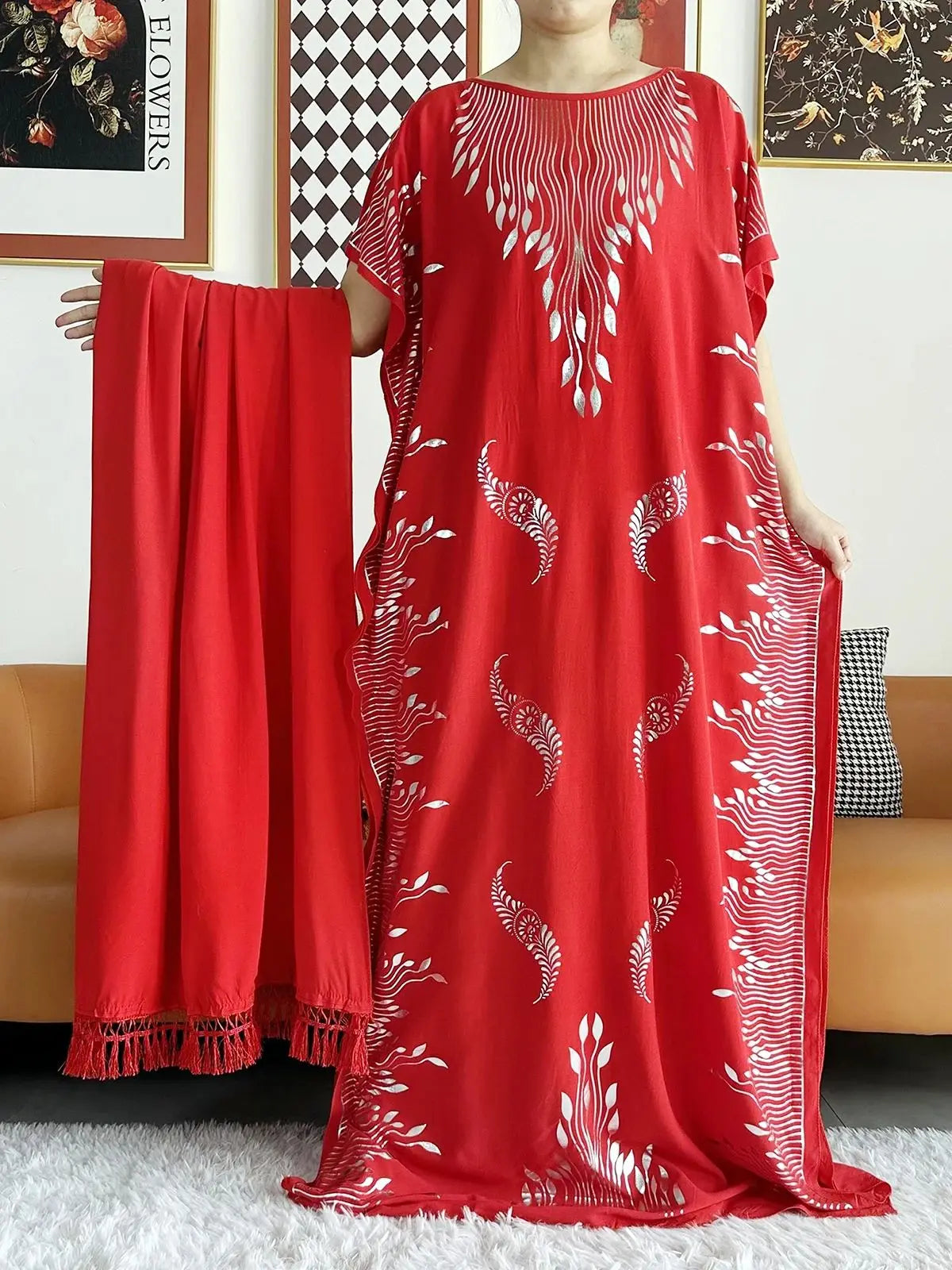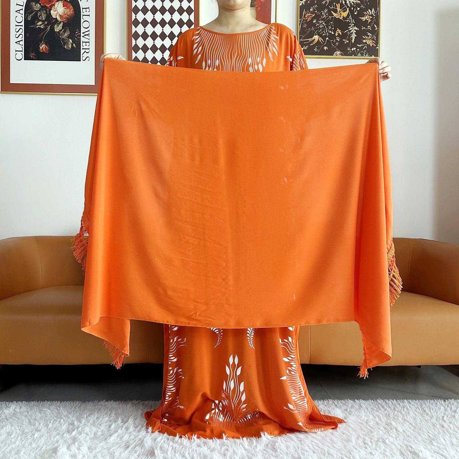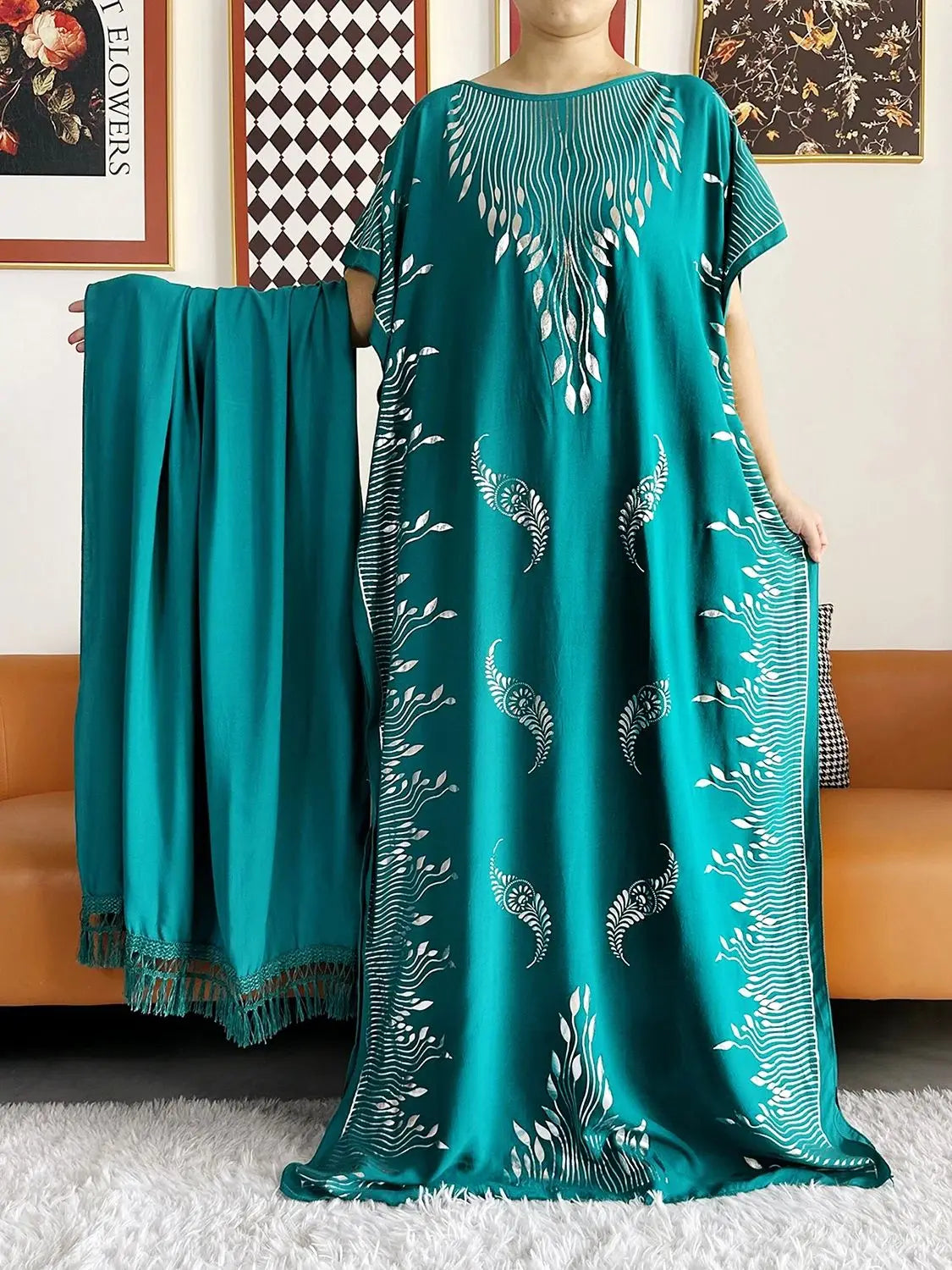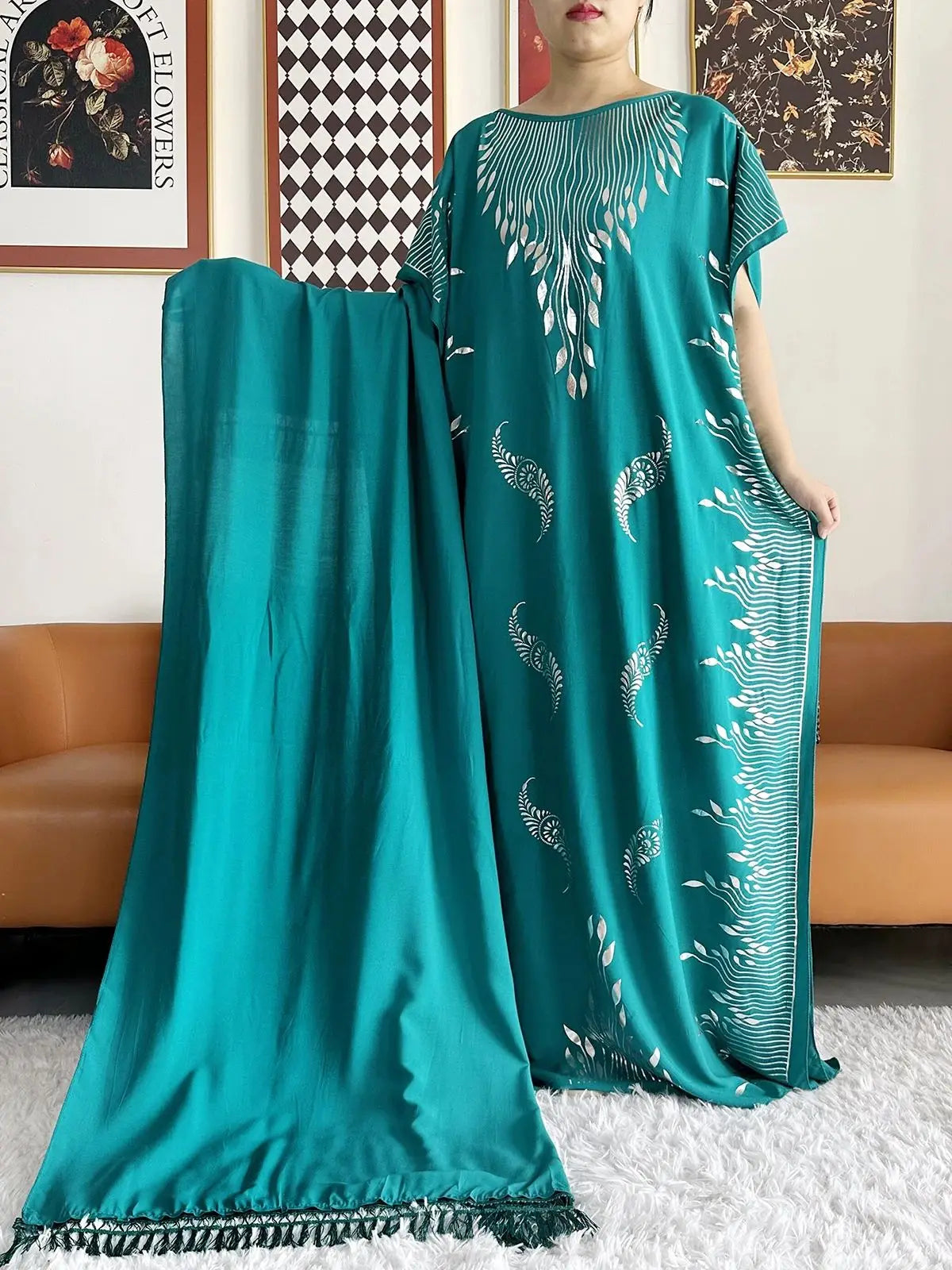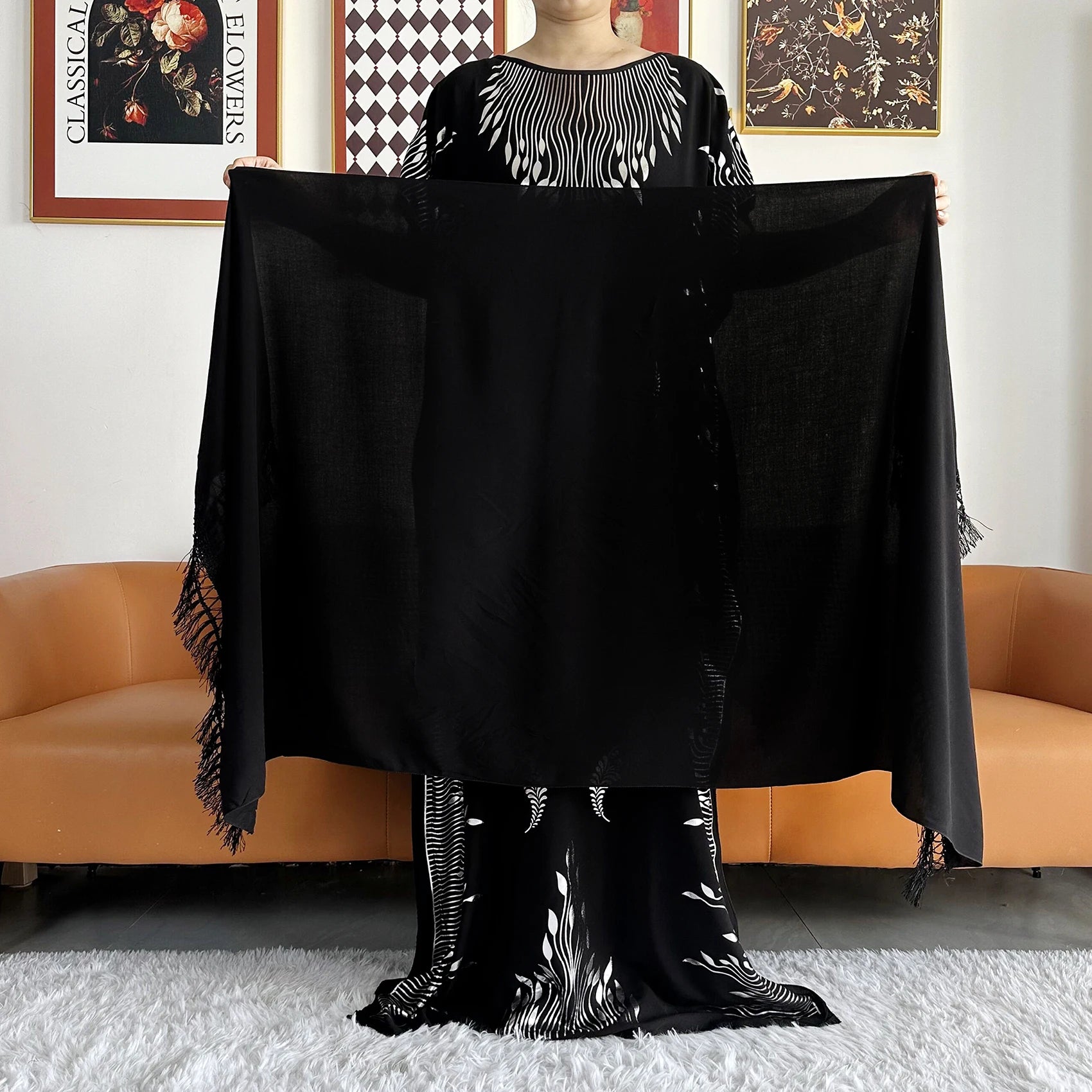 Luftig och elegant abaya för kvinnor, perfekt för sommar. Tillverkad i mjuk bomull med kort ärm, dekorativa guldfärgade tryck och tofsdetaljer. Levereras med stor matchande sjal, passar både vardag och festliga tillfällen.