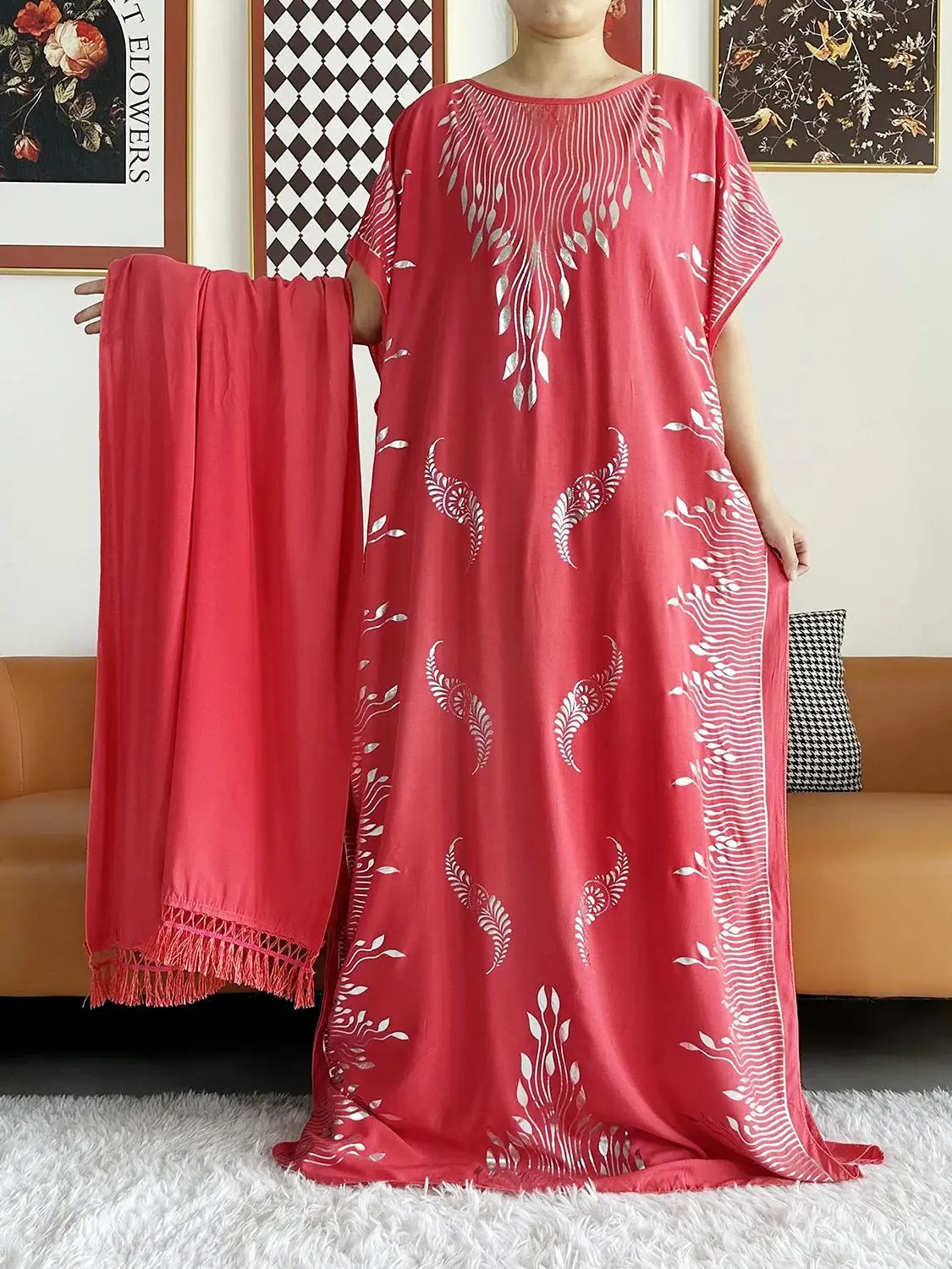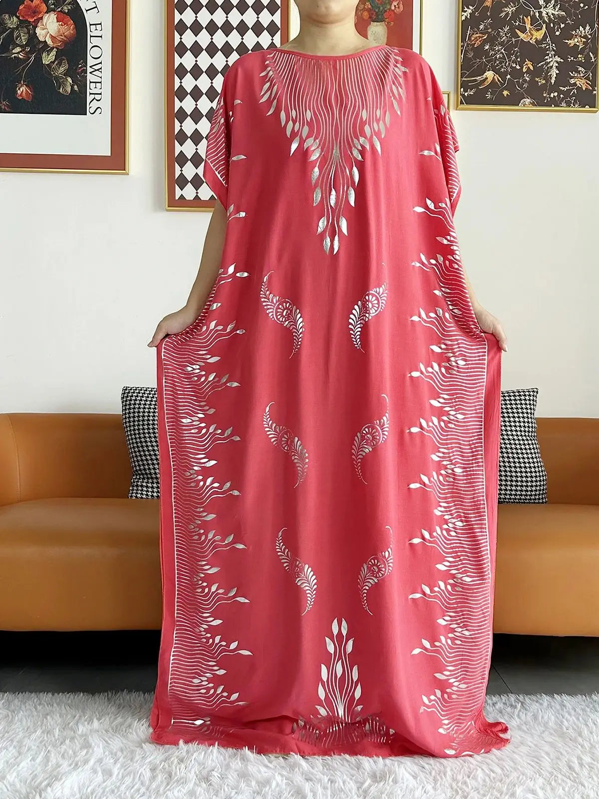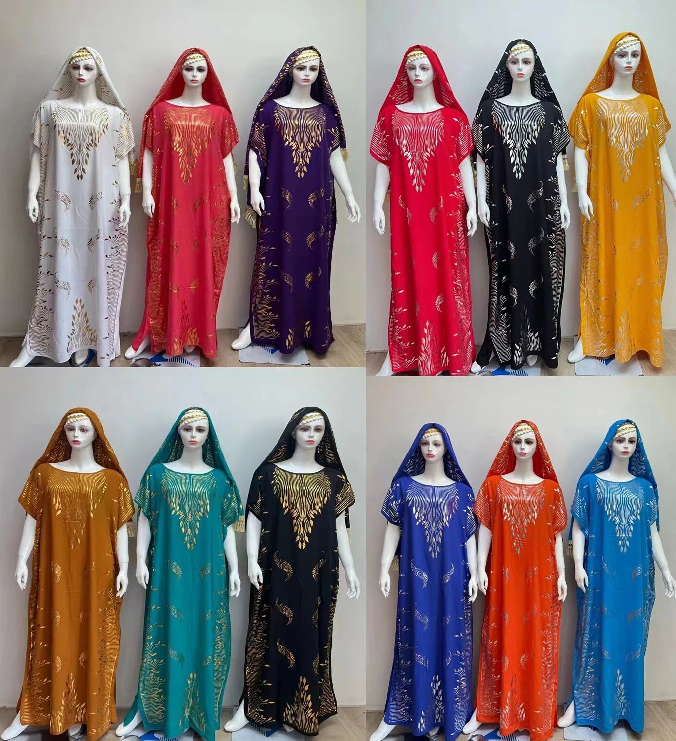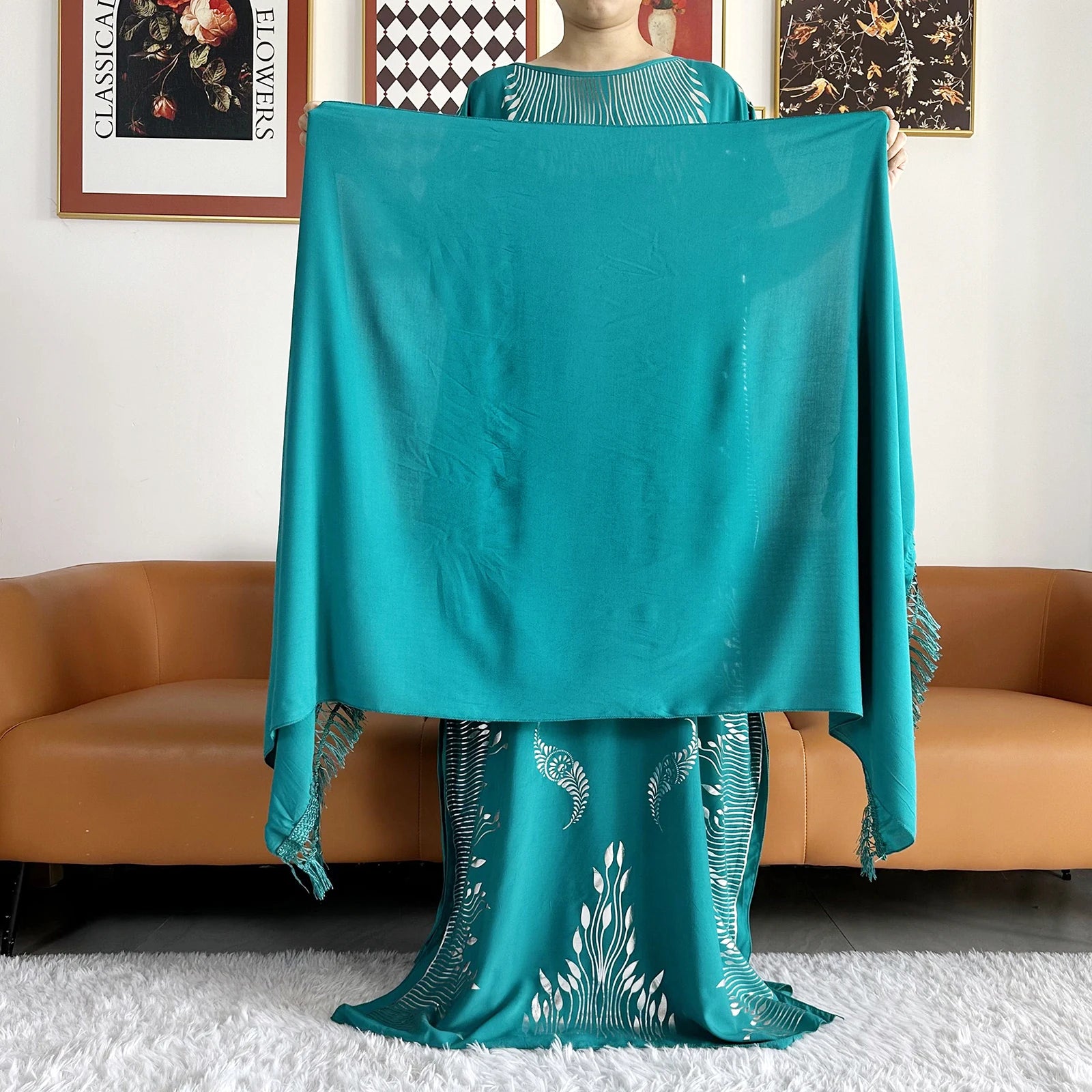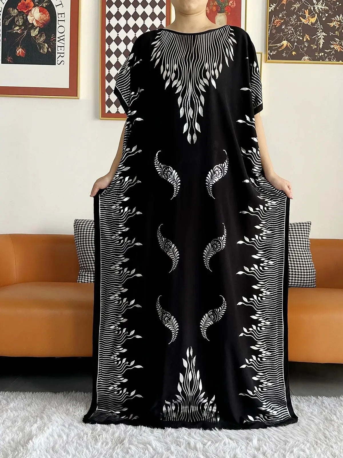 Luftig och elegant abaya för kvinnor, perfekt för sommar. Tillverkad i mjuk bomull med kort ärm, dekorativa guldfärgade tryck och tofsdetaljer. Levereras med stor matchande sjal, passar både vardag och festliga tillfällen.