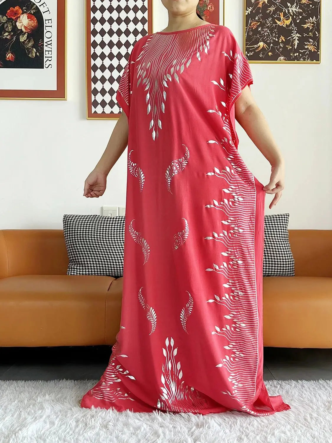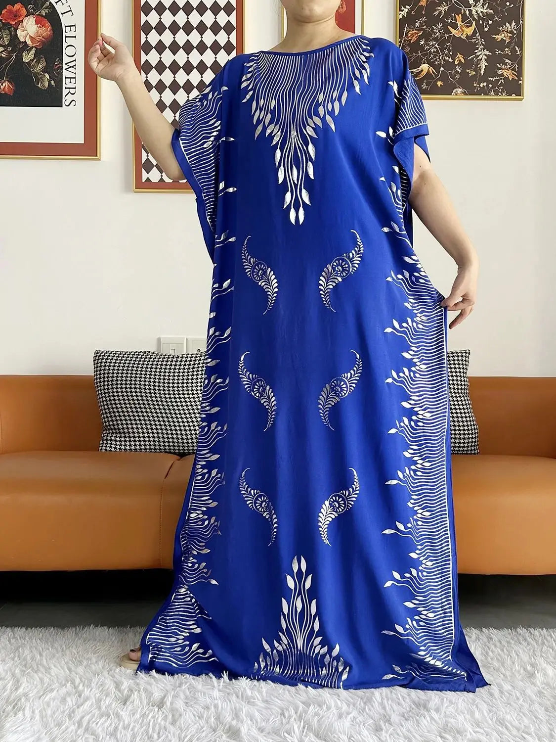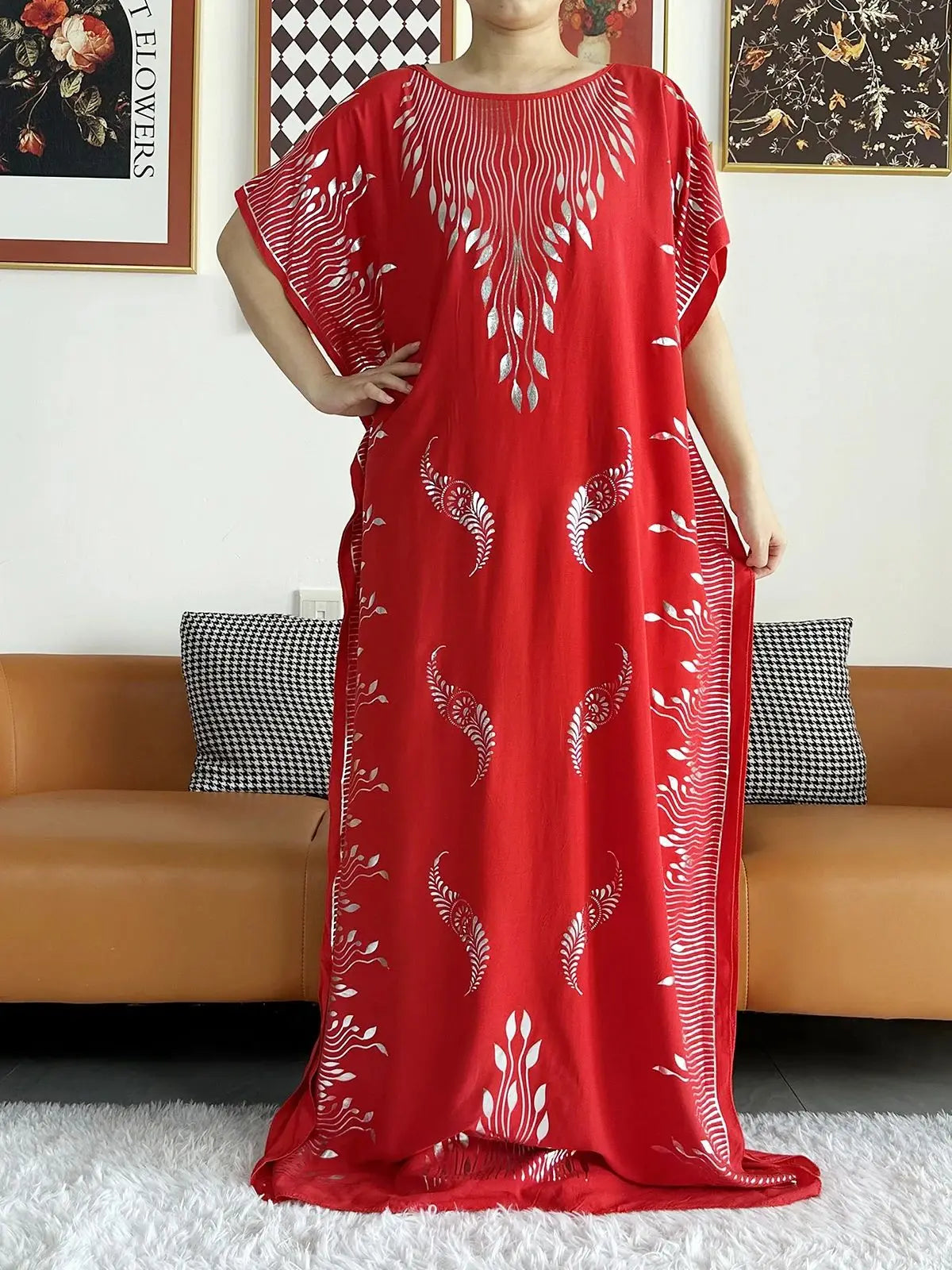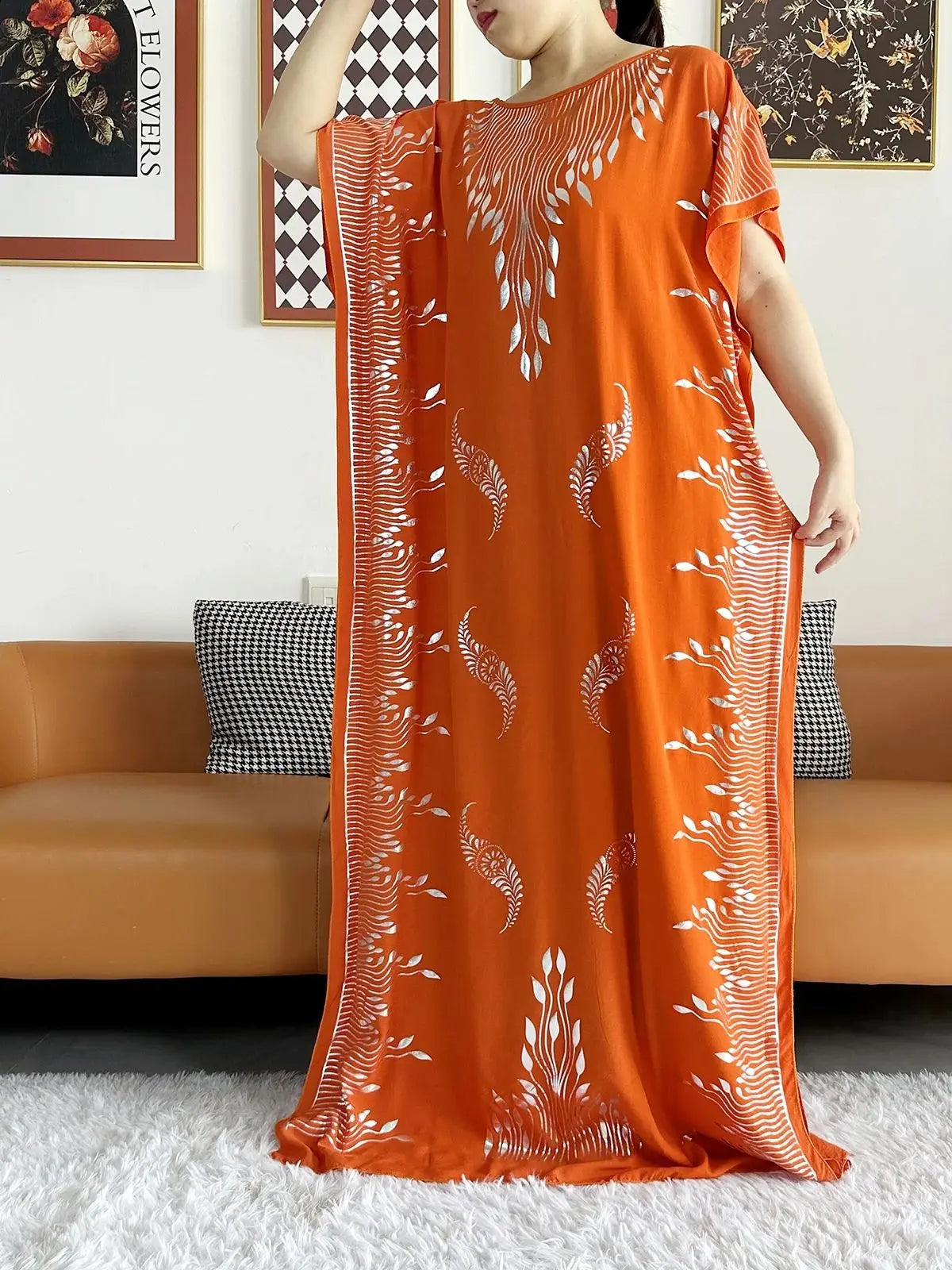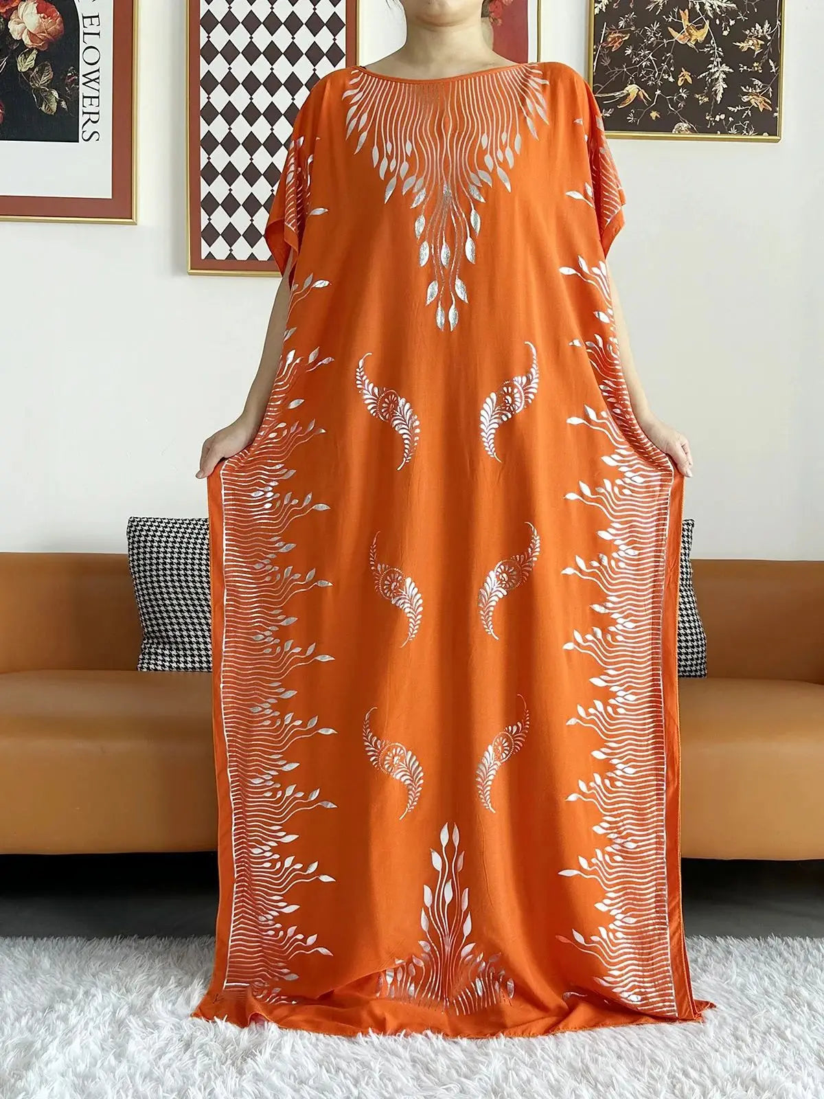 Luftig och elegant abaya för kvinnor, perfekt för sommar. Tillverkad i mjuk bomull med kort ärm, dekorativa guldfärgade tryck och tofsdetaljer. Levereras med stor matchande sjal, passar både vardag och festliga tillfällen.