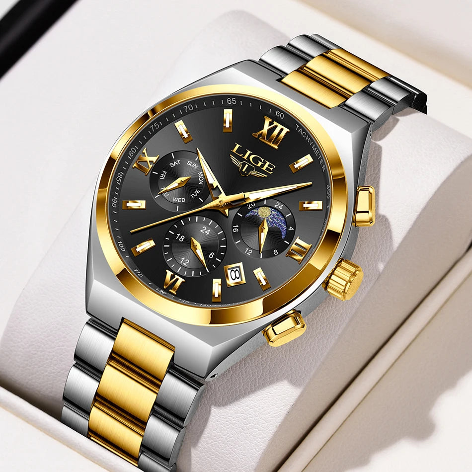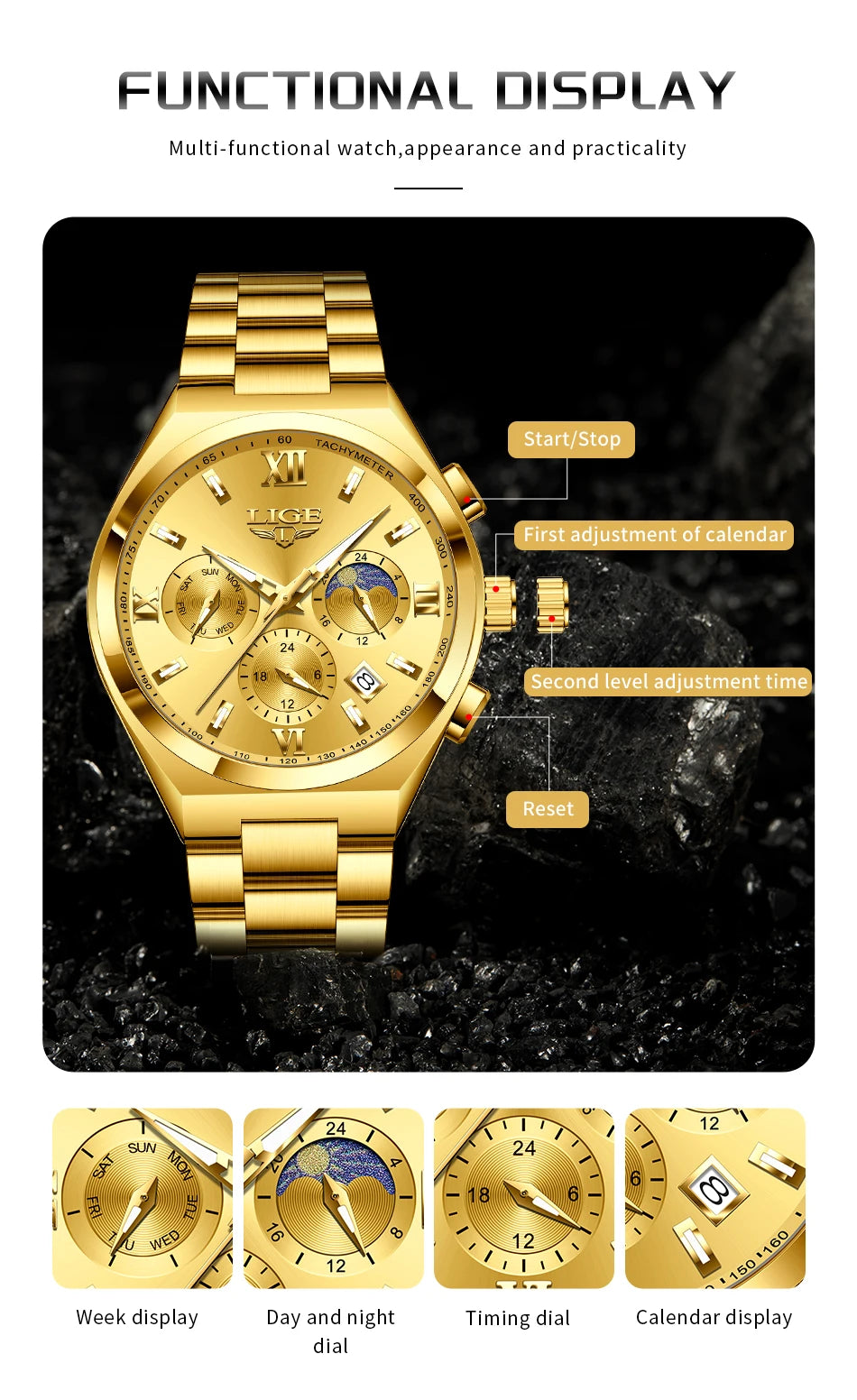 LIGE damklocka är en elegant och lyxig quartzklocka designad för kvinnor som vill kombinera stil, funktion och kvalitet. Den guldfärgade boetten och armbandet i rostfritt stål ger ett sofistikerat uttryck som passar lika bra till vardag som till festliga tillfällen.
