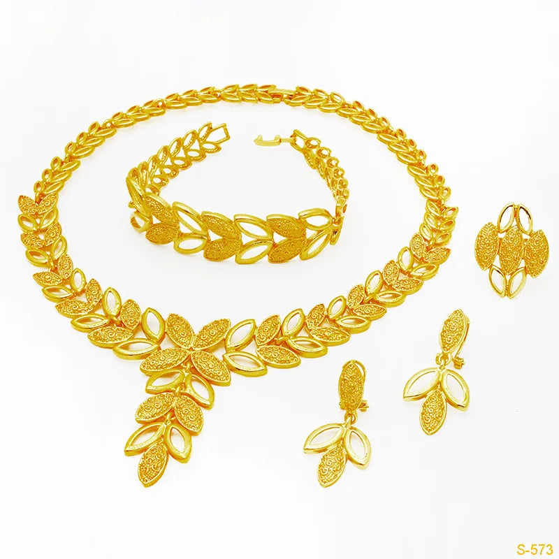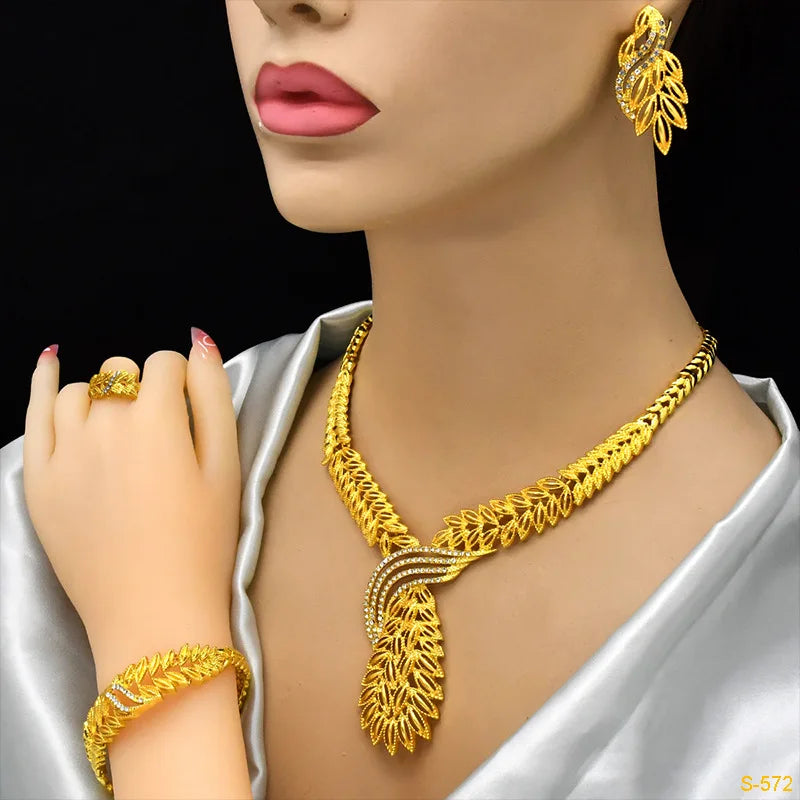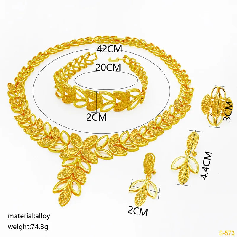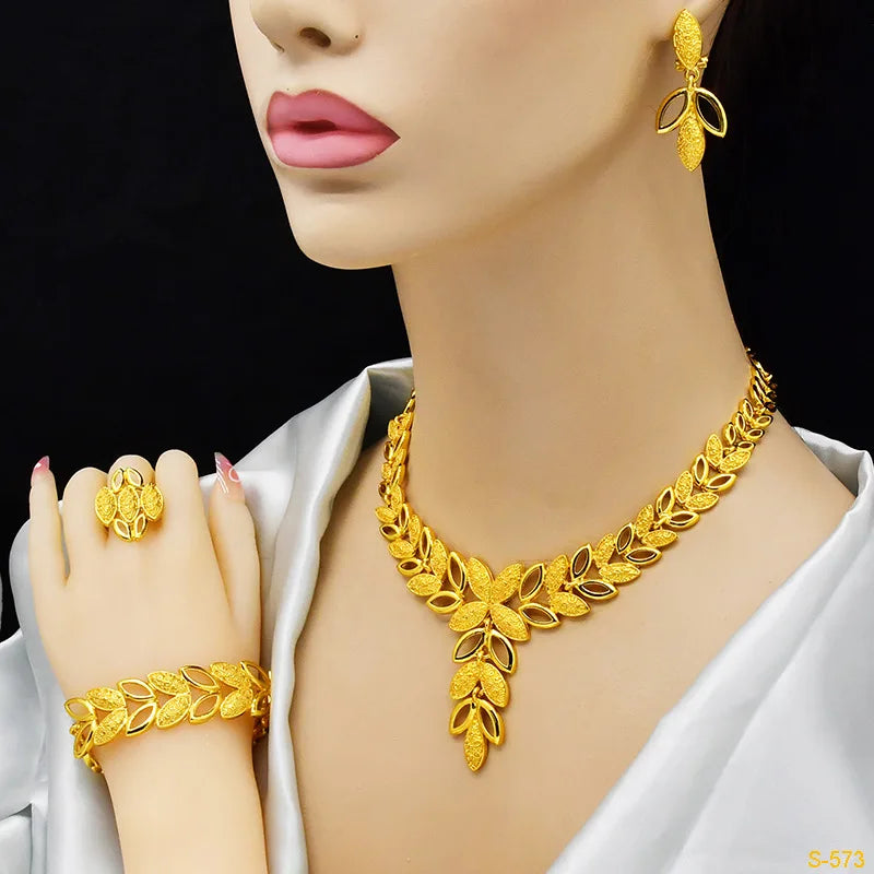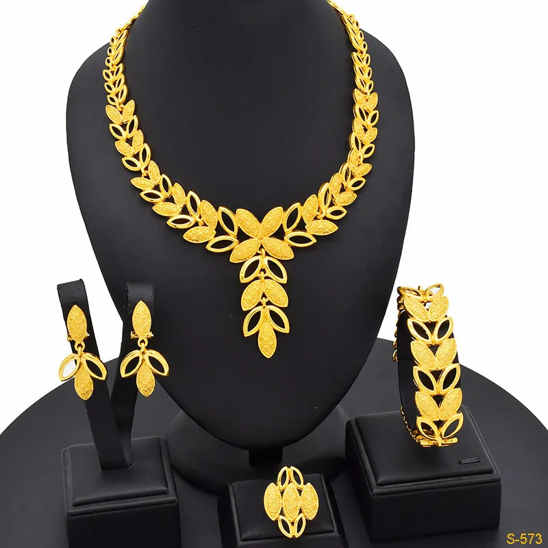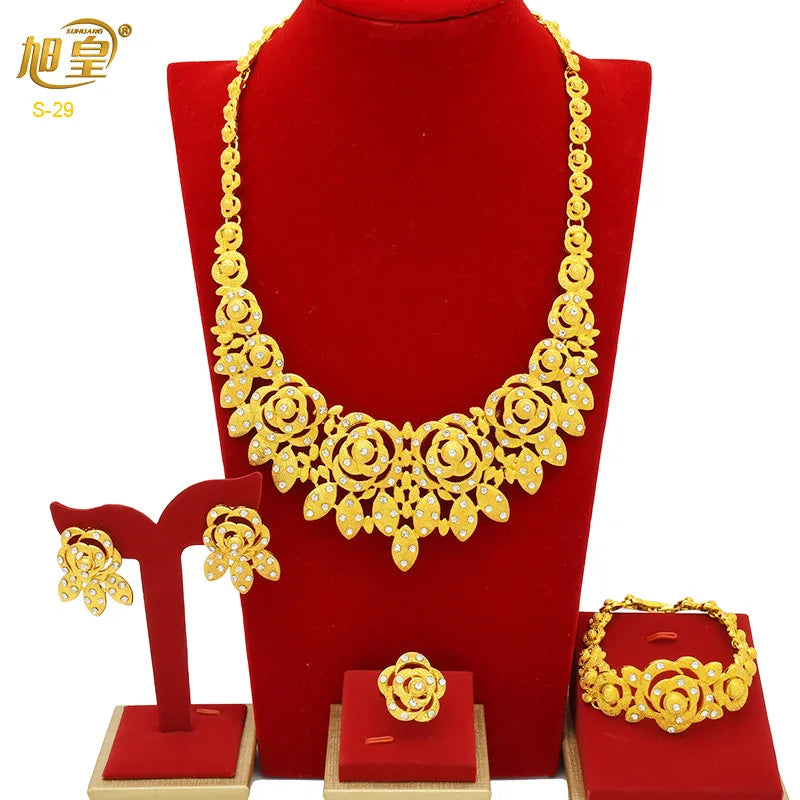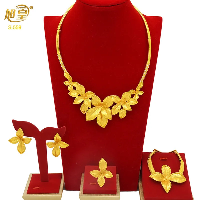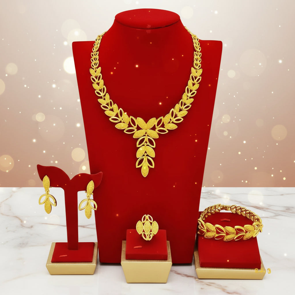 Lyxigt smyckesset i exklusiv Dubai-stil med 24K guldfärg och elegant blom- och droppformad design. Setet innehåller långt halsband, örhängen, armband och ring som ger en glamorös och feminin look. Perfekt för bröllop, fest och högtidliga tillfällen. Ett iögonfallande val för kvinnor som vill bära smycken med lyxkänsla.
