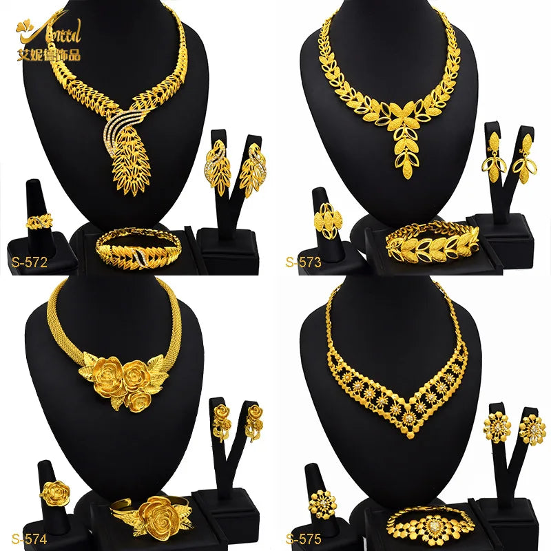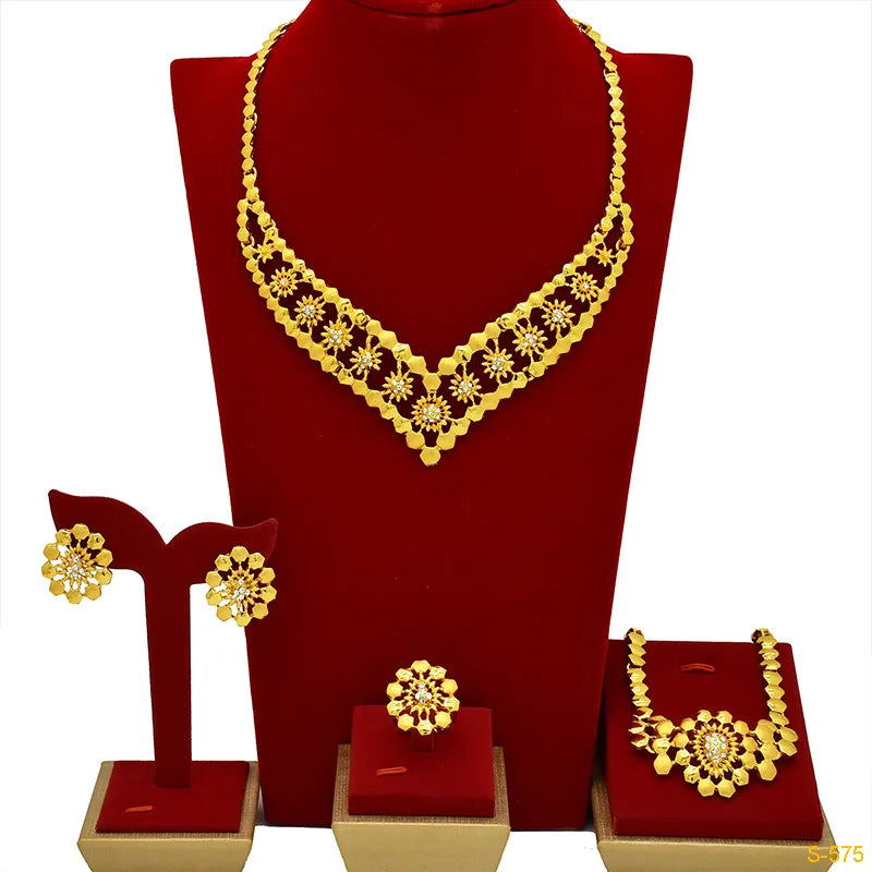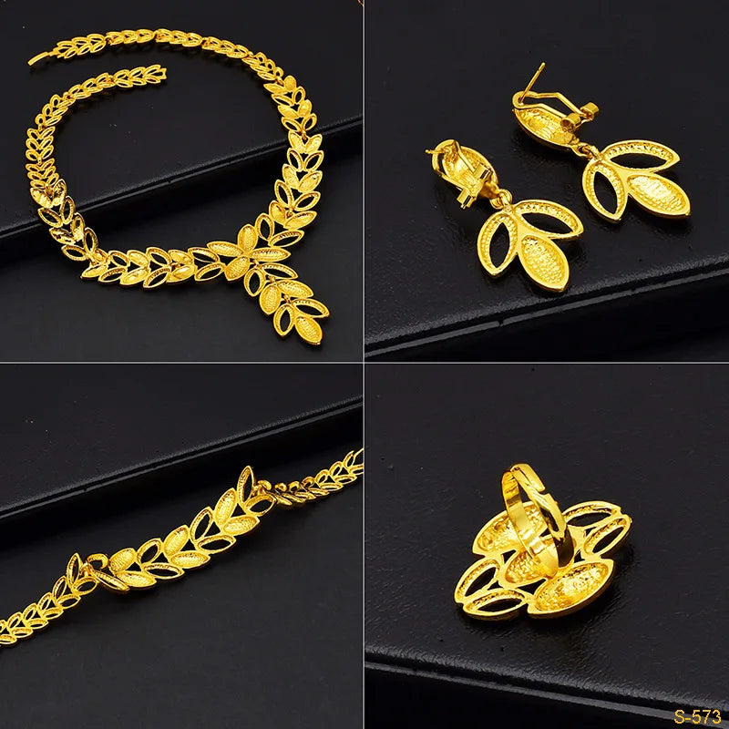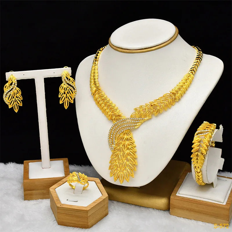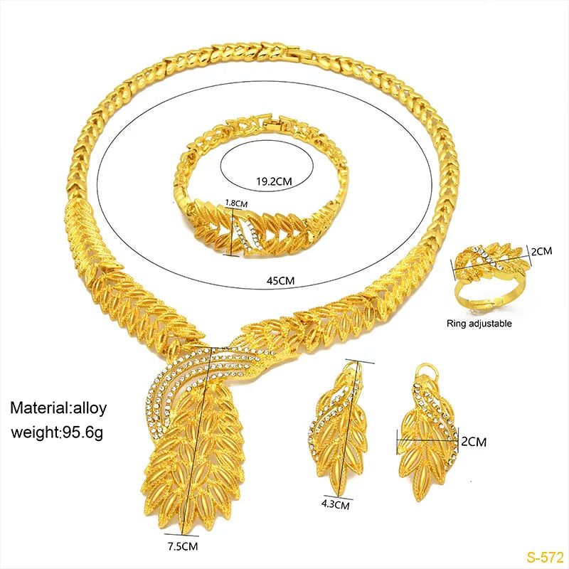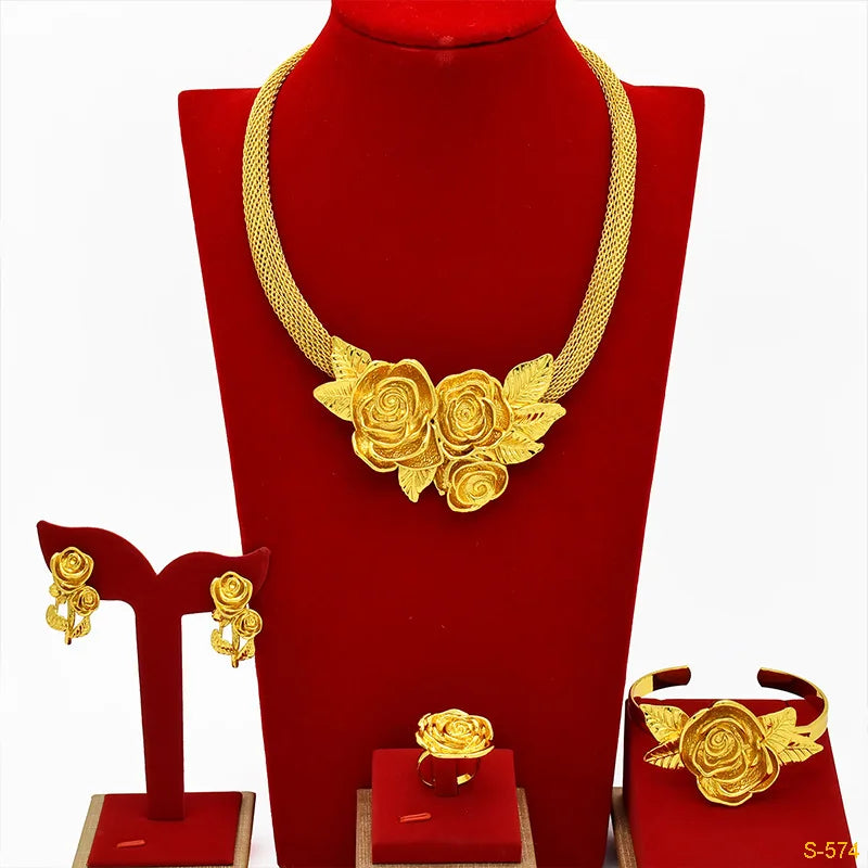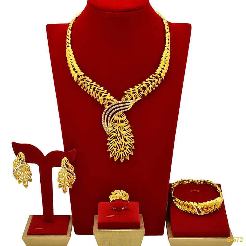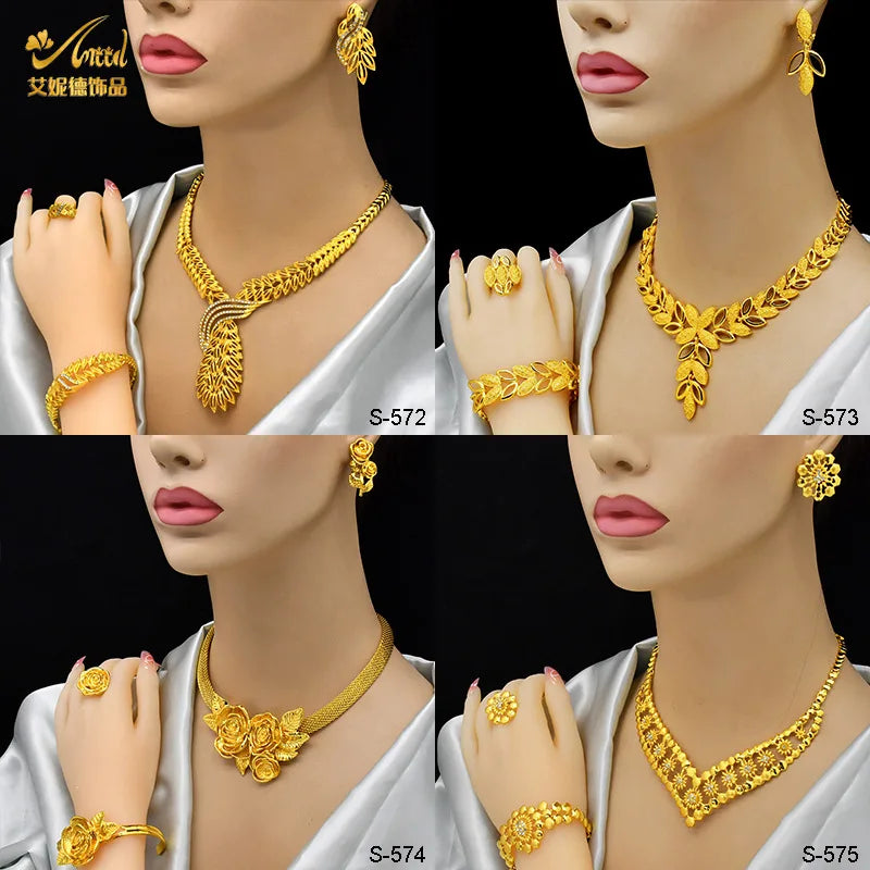 Lyxigt smyckesset i exklusiv Dubai-stil med 24K guldfärg och elegant blom- och droppformad design. Setet innehåller långt halsband, örhängen, armband och ring som ger en glamorös och feminin look. Perfekt för bröllop, fest och högtidliga tillfällen. Ett iögonfallande val för kvinnor som vill bära smycken med lyxkänsla.