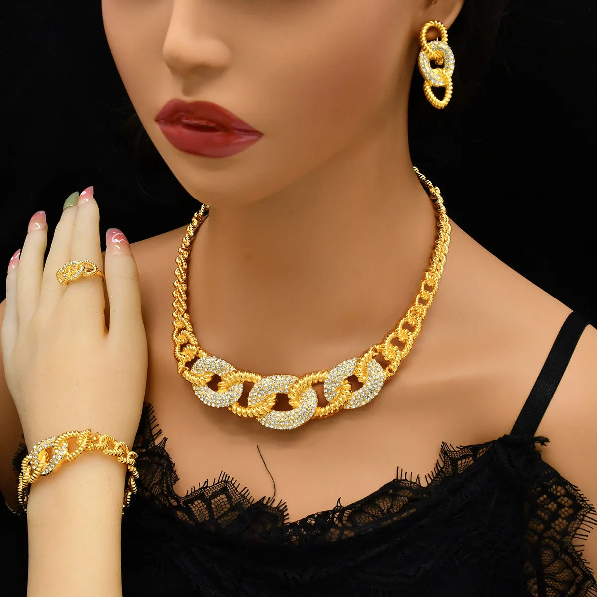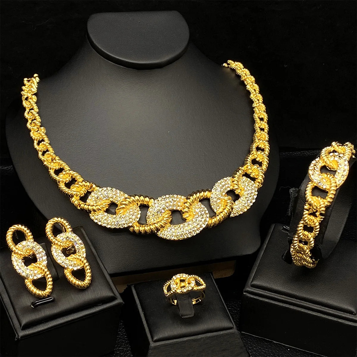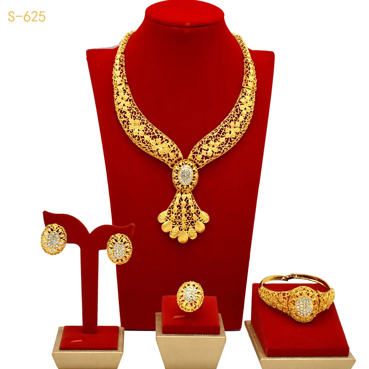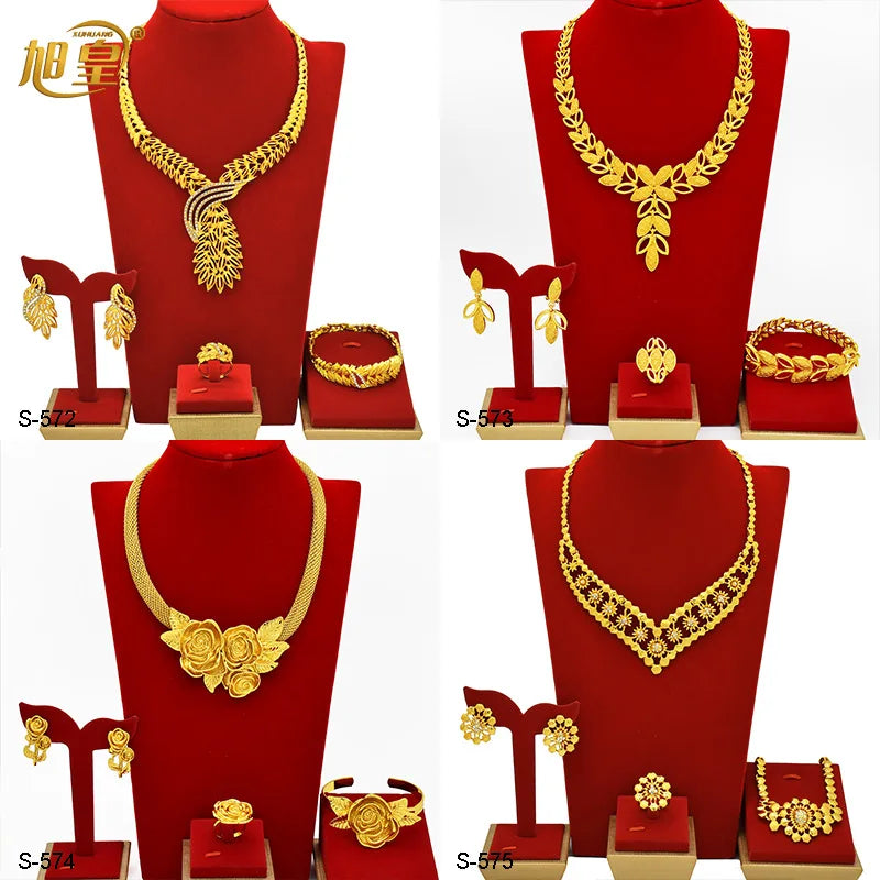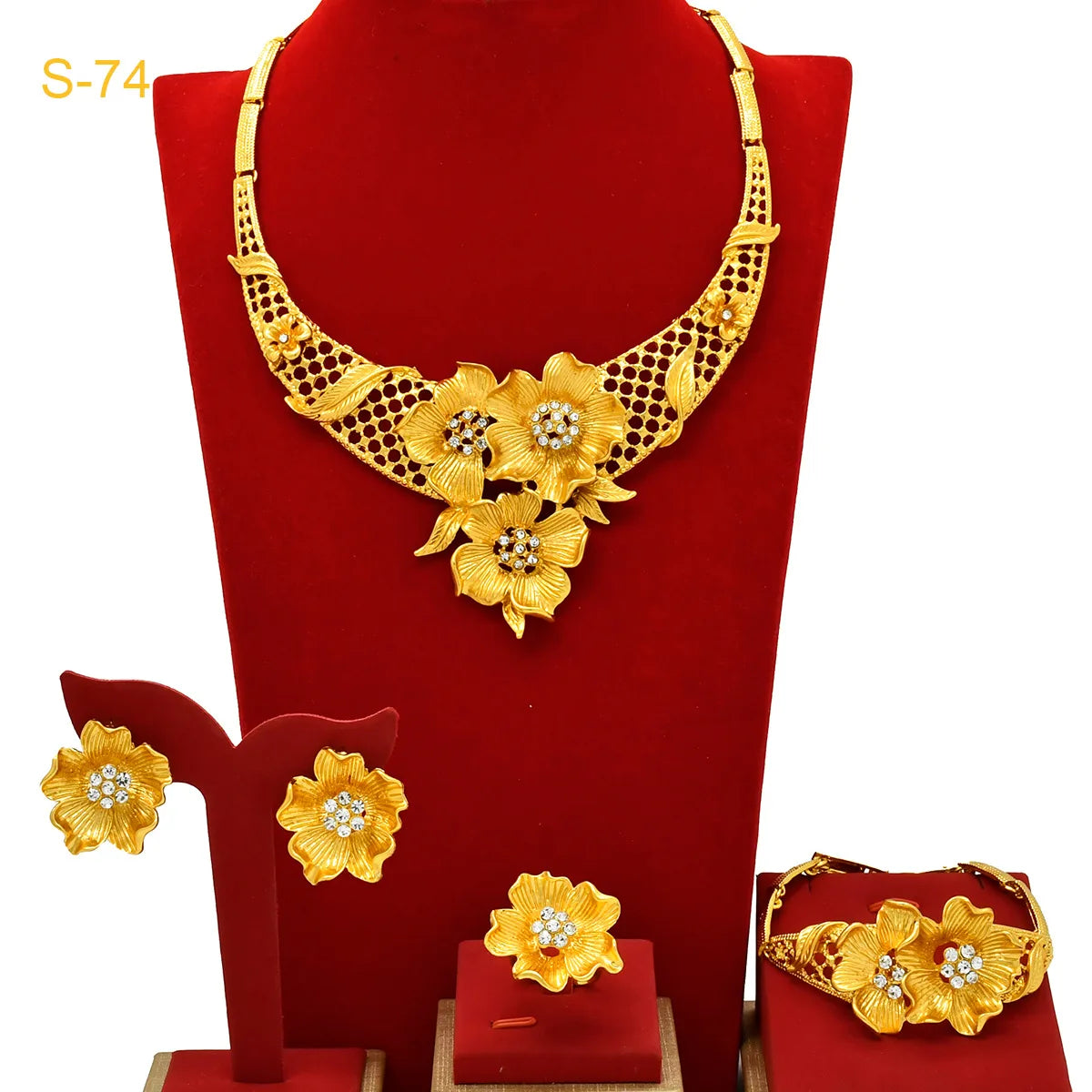 Lyxigt smyckesset i exklusiv Dubai-stil med 24K guldfärg och elegant blom- och droppformad design. Setet innehåller långt halsband, örhängen, armband och ring som ger en glamorös och feminin look. Perfekt för bröllop, fest och högtidliga tillfällen. Ett iögonfallande val för kvinnor som vill bära smycken med lyxkänsla.