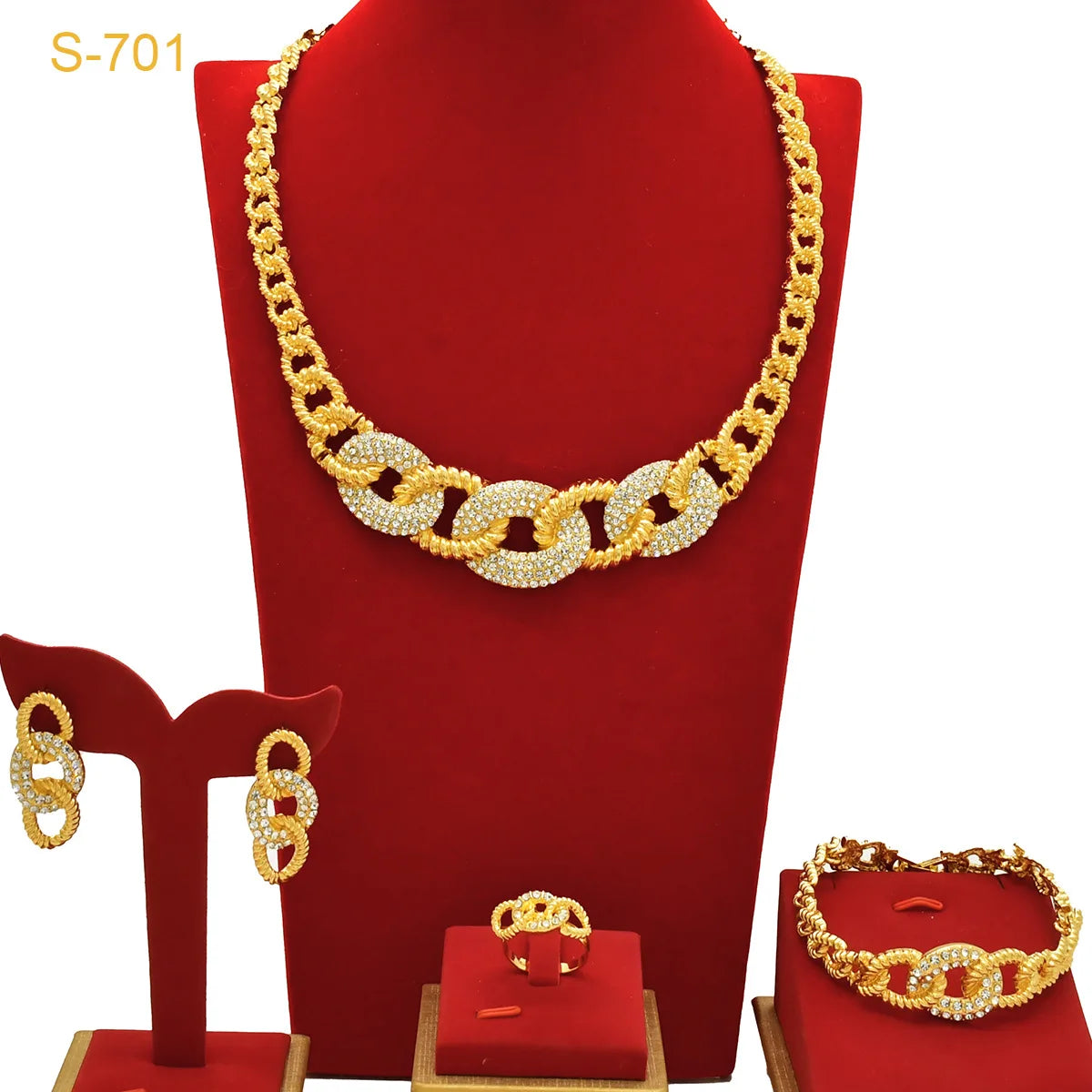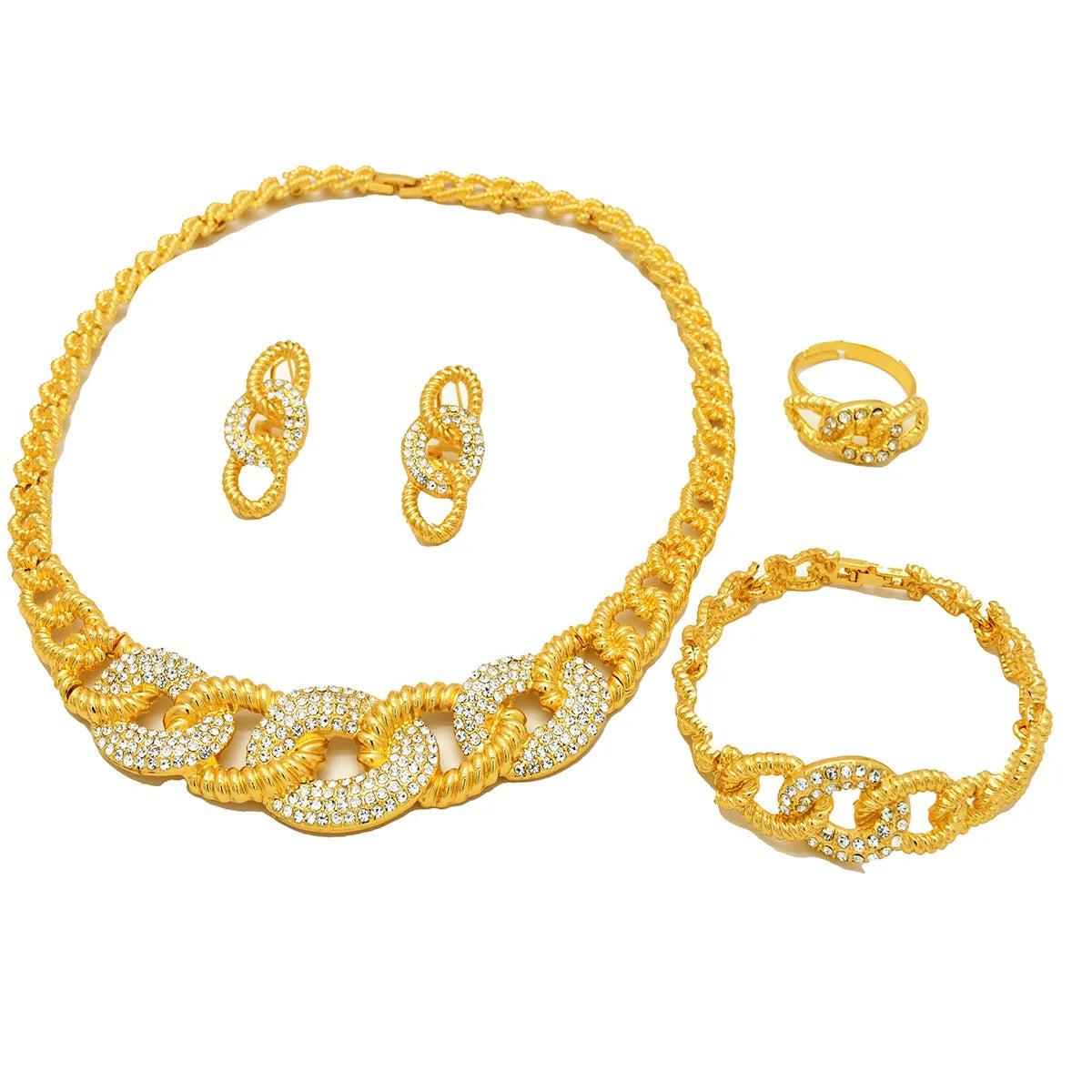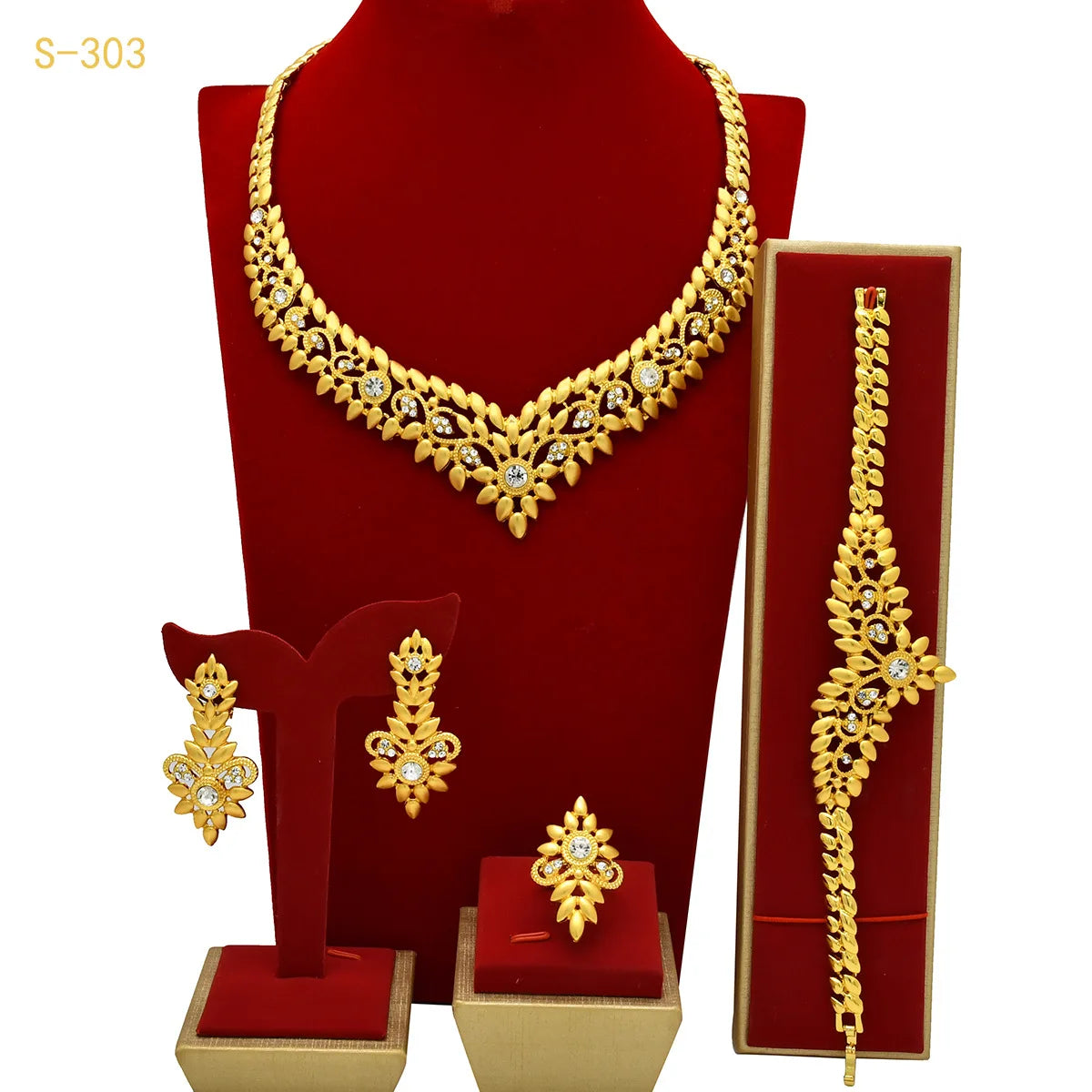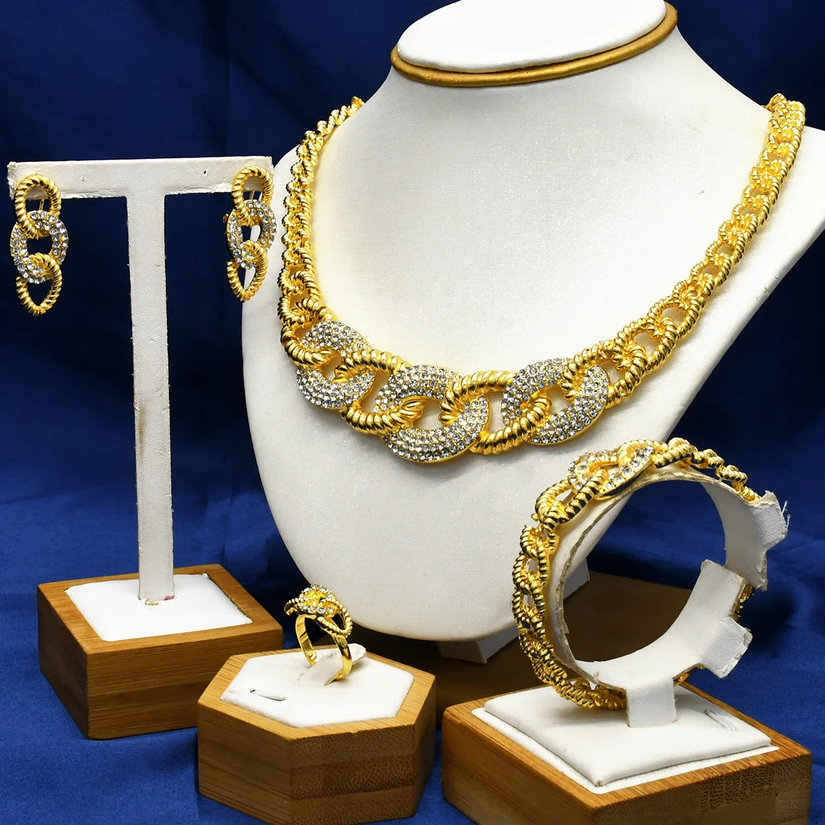 Lyxigt smyckesset i exklusiv Dubai-stil med 24K guldfärg och elegant blom- och droppformad design. Setet innehåller långt halsband, örhängen, armband och ring som ger en glamorös och feminin look. Perfekt för bröllop, fest och högtidliga tillfällen. Ett iögonfallande val för kvinnor som vill bära smycken med lyxkänsla.
