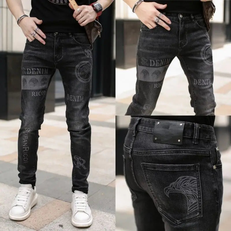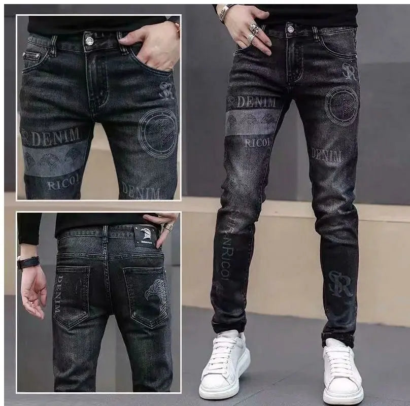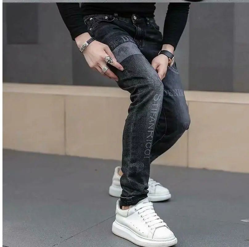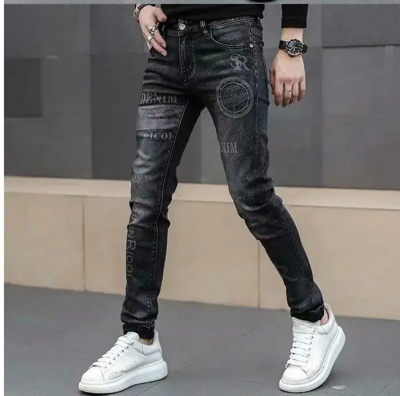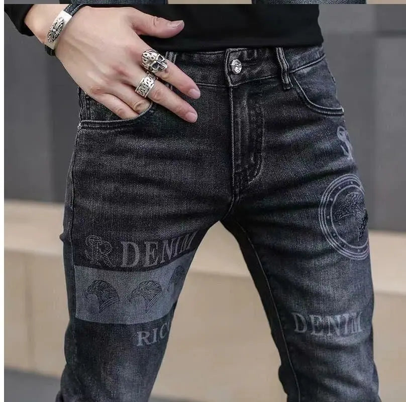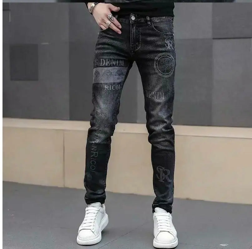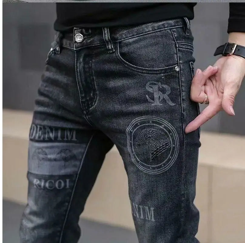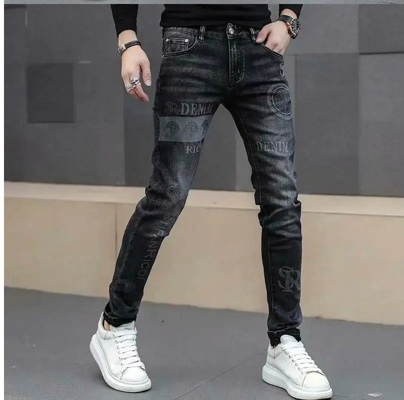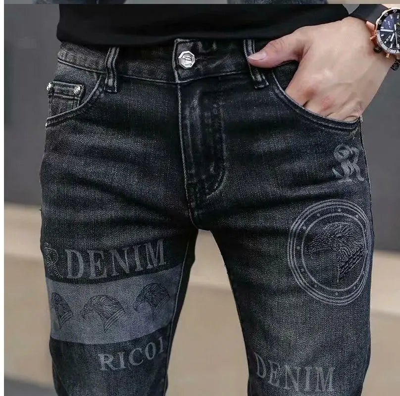 Exklusiva Svarta Herrjeans med Unikt Tryck – Premium Stretch Denim