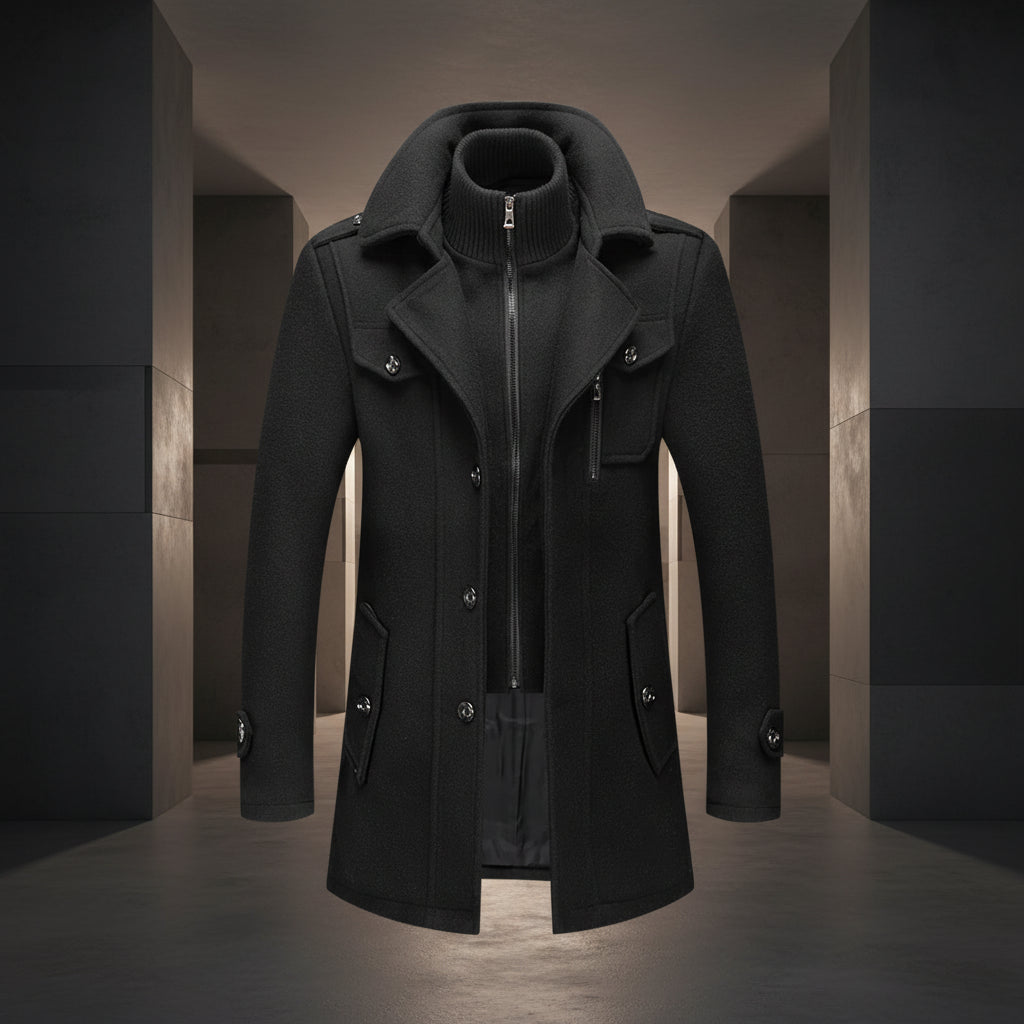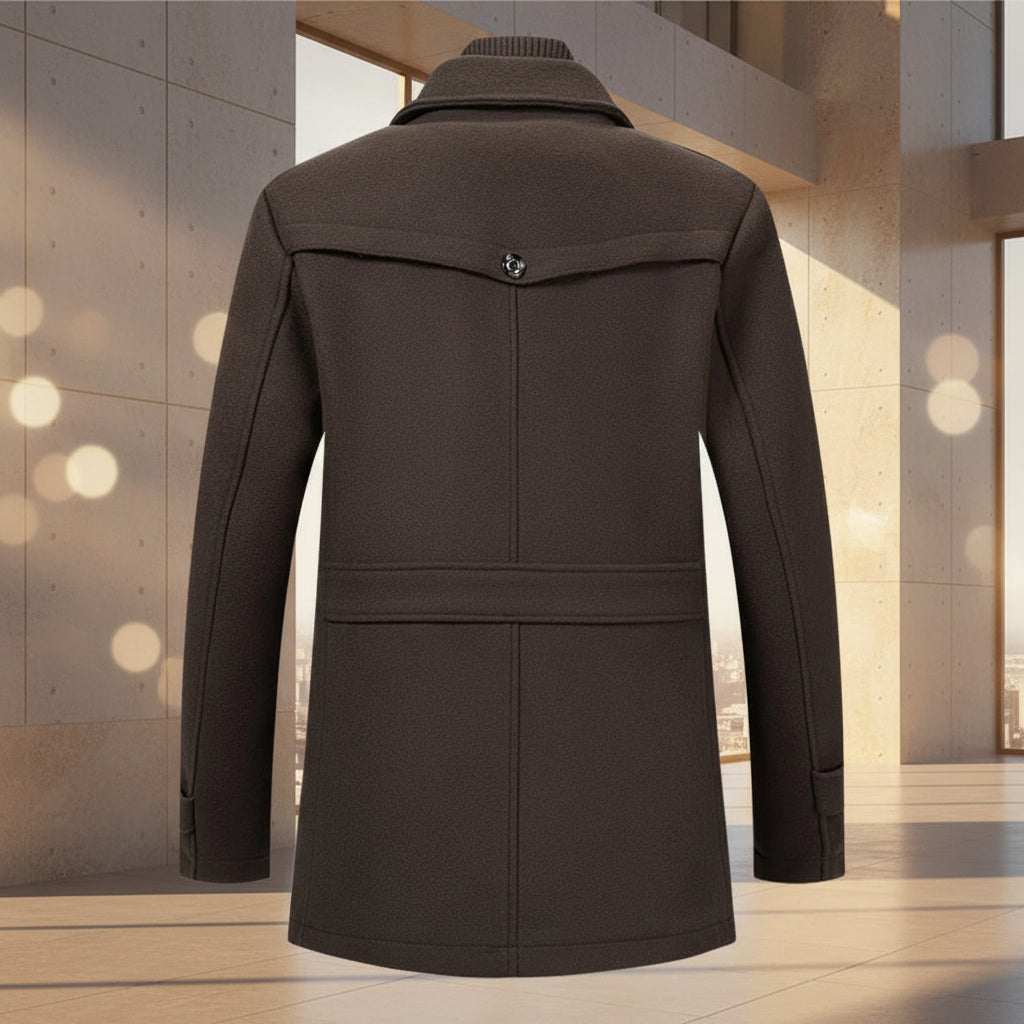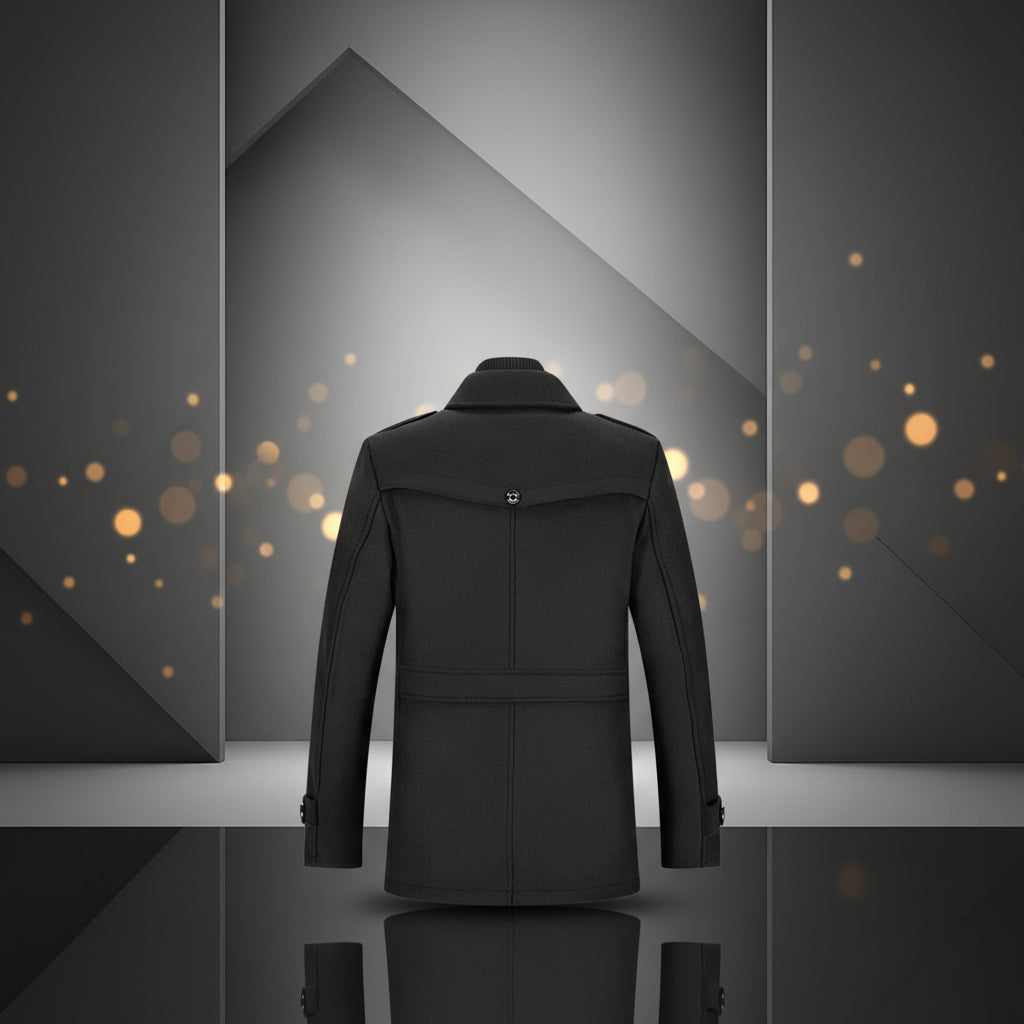 Upptäck den perfekta kombinationen av elegans, värme och stil med vår exklusiva vinterrock för män. En lång ullrock i cashmere-blandning med dubbel krage och modern business-casual design. Perfekt för både kontoret och citylooken under kalla dagar.