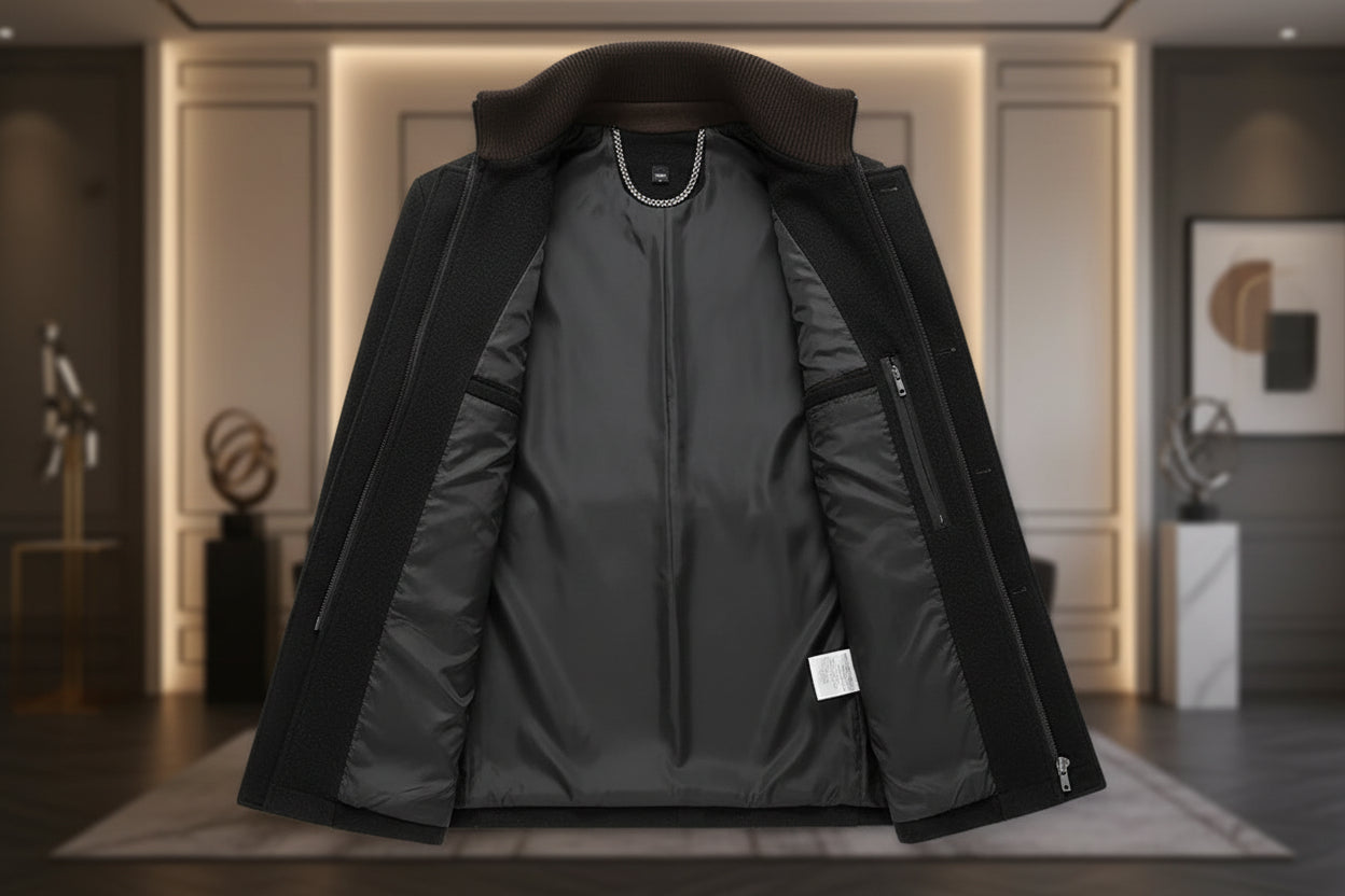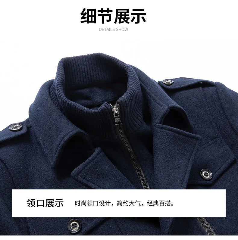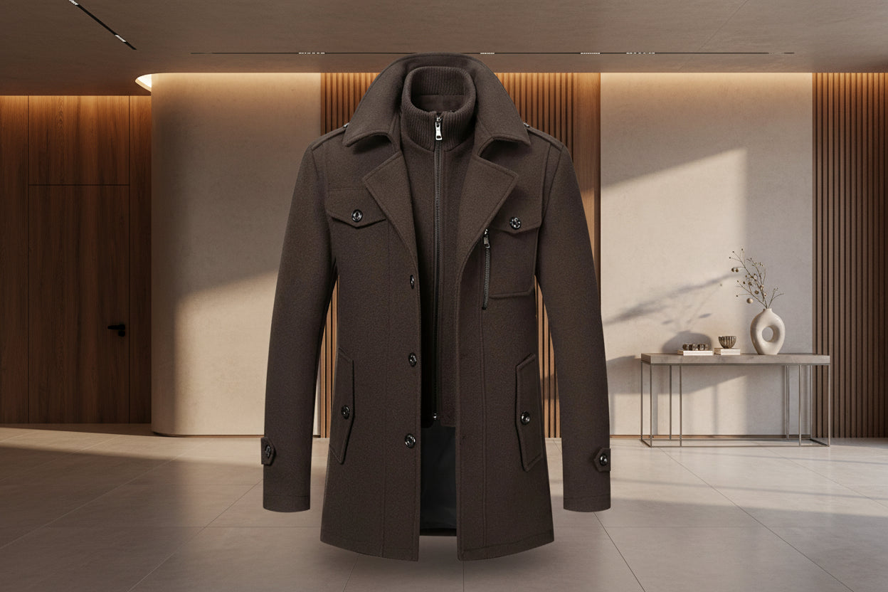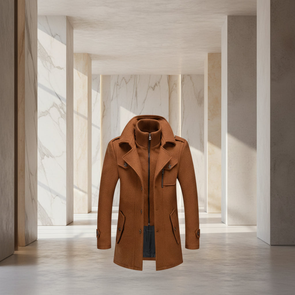 Upptäck den perfekta kombinationen av elegans, värme och stil med vår exklusiva vinterrock för män. En lång ullrock i cashmere-blandning med dubbel krage och modern business-casual design. Perfekt för både kontoret och citylooken under kalla dagar.