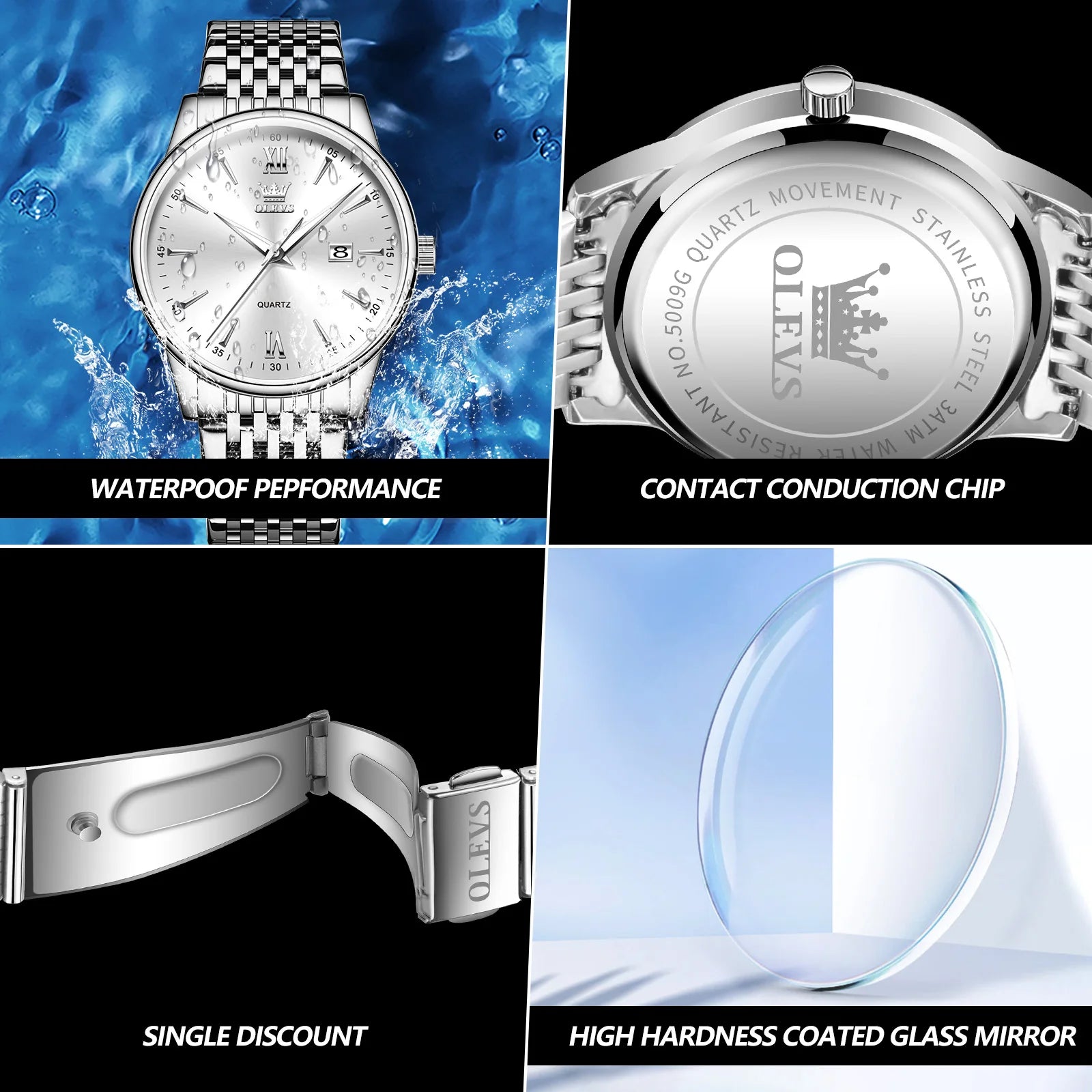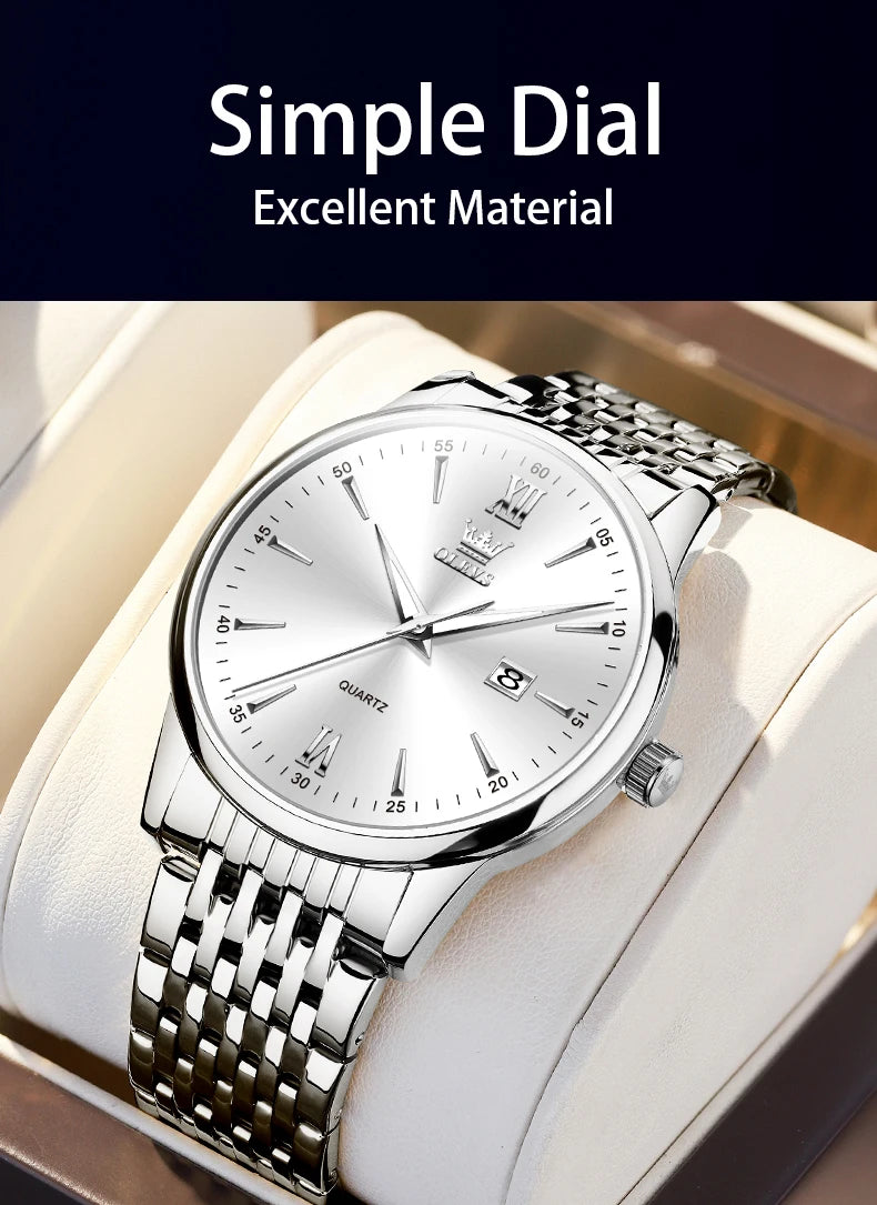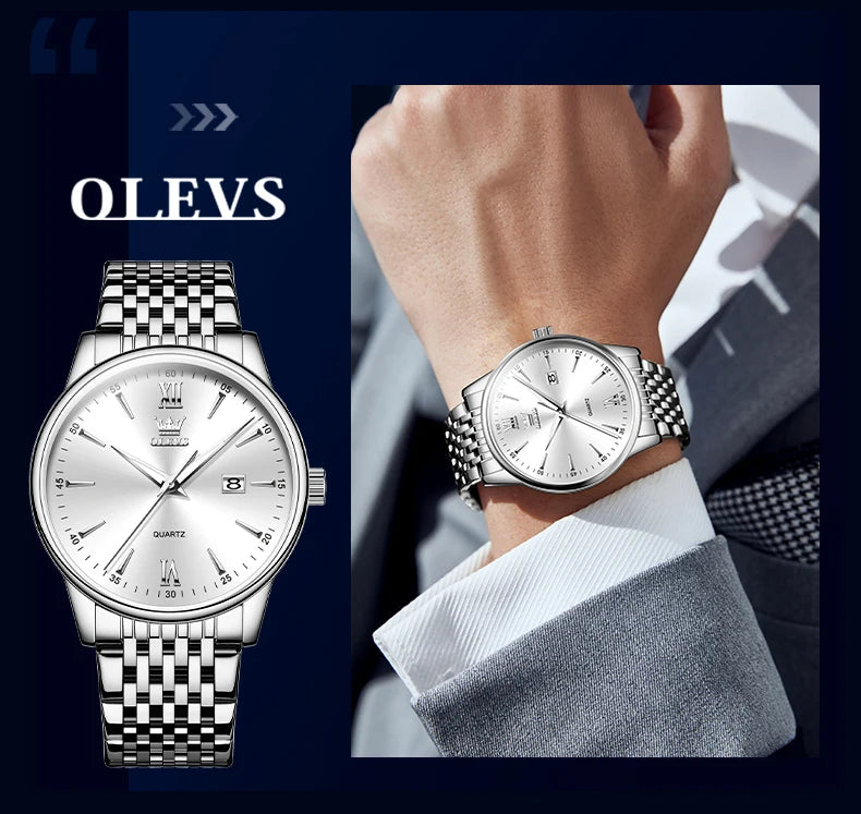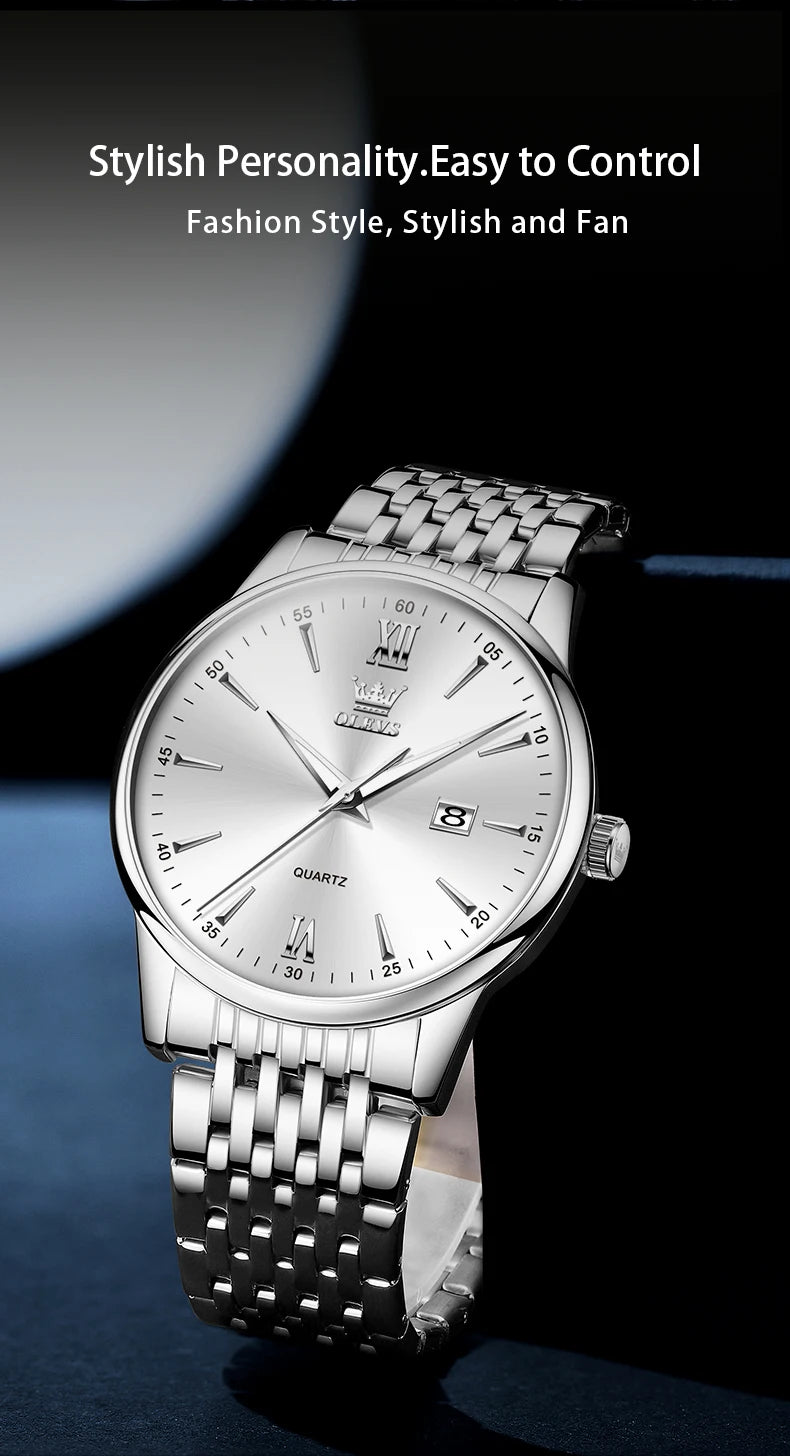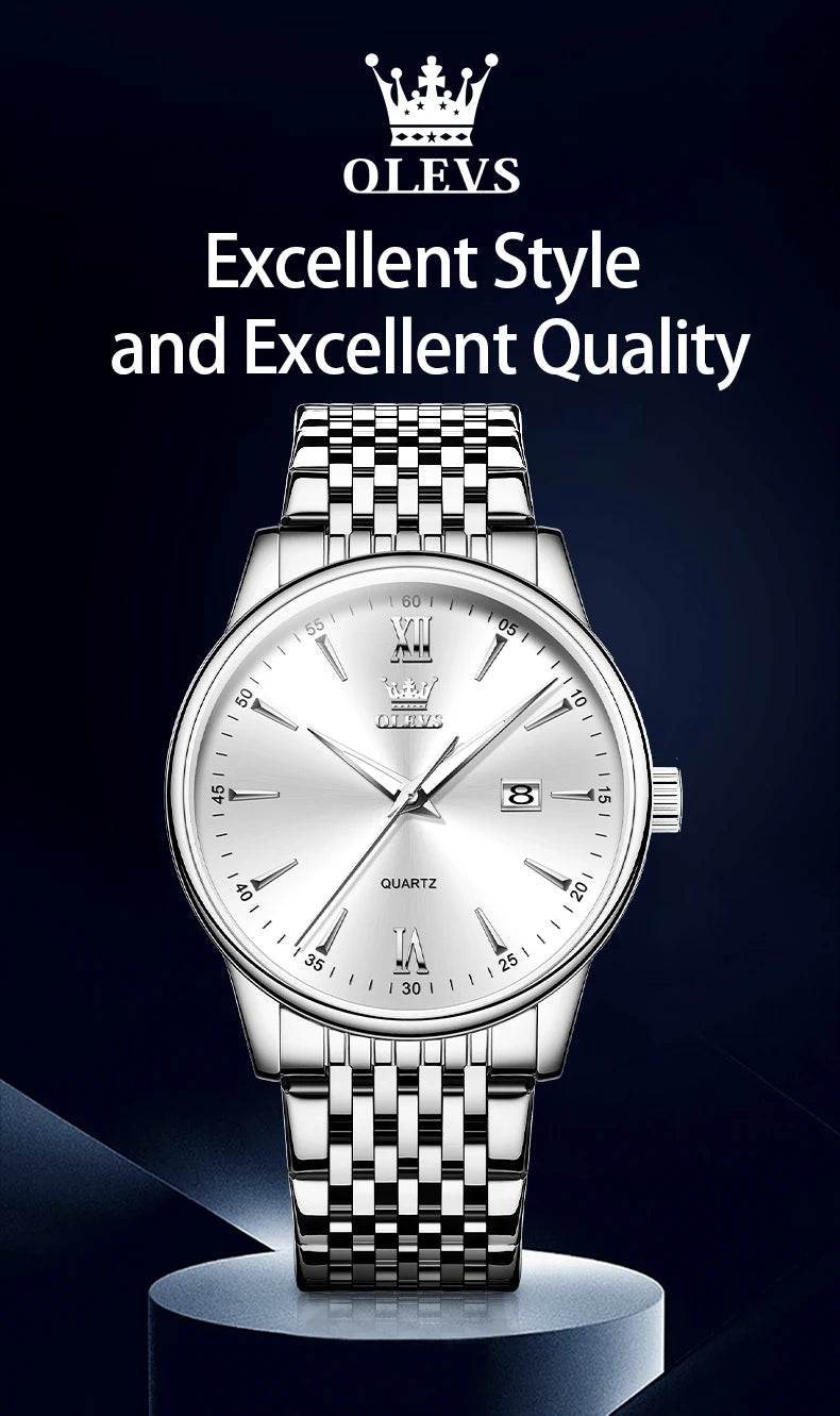 OLEVS herrklocka är ett exklusivt armbandsur för män som uppskattar klassisk elegans kombinerad med modern funktionalitet. Klockan är tillverkad helt i rostfritt stål med en slimmad boett på endast 10 mm, vilket ger ett sofistikerat och bekvämt intryck på handleden.