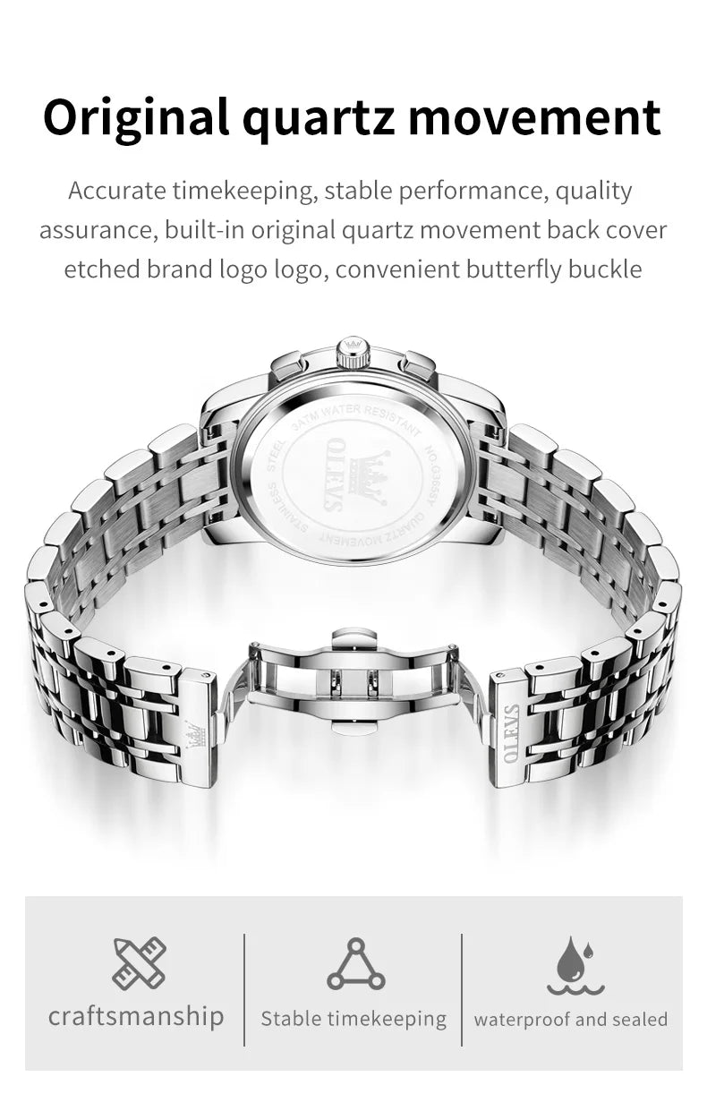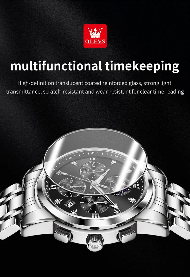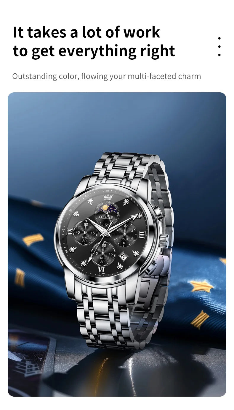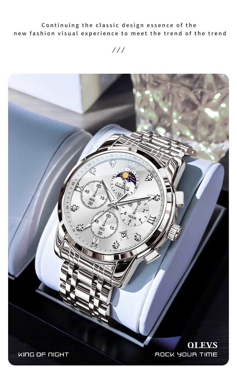 OLEVS 3655 är en mästerverk av klassisk klockkonst som kombinerar sofistikerad månfas-komplikation med professionell kronograf. Denna prestigefyllda herrur med automatisk datum, luminösa visare och vattentät konstruktion är skapad för män som uppskattar äkta kvalitet, avancerad funktionalitet och tidlös elegans.