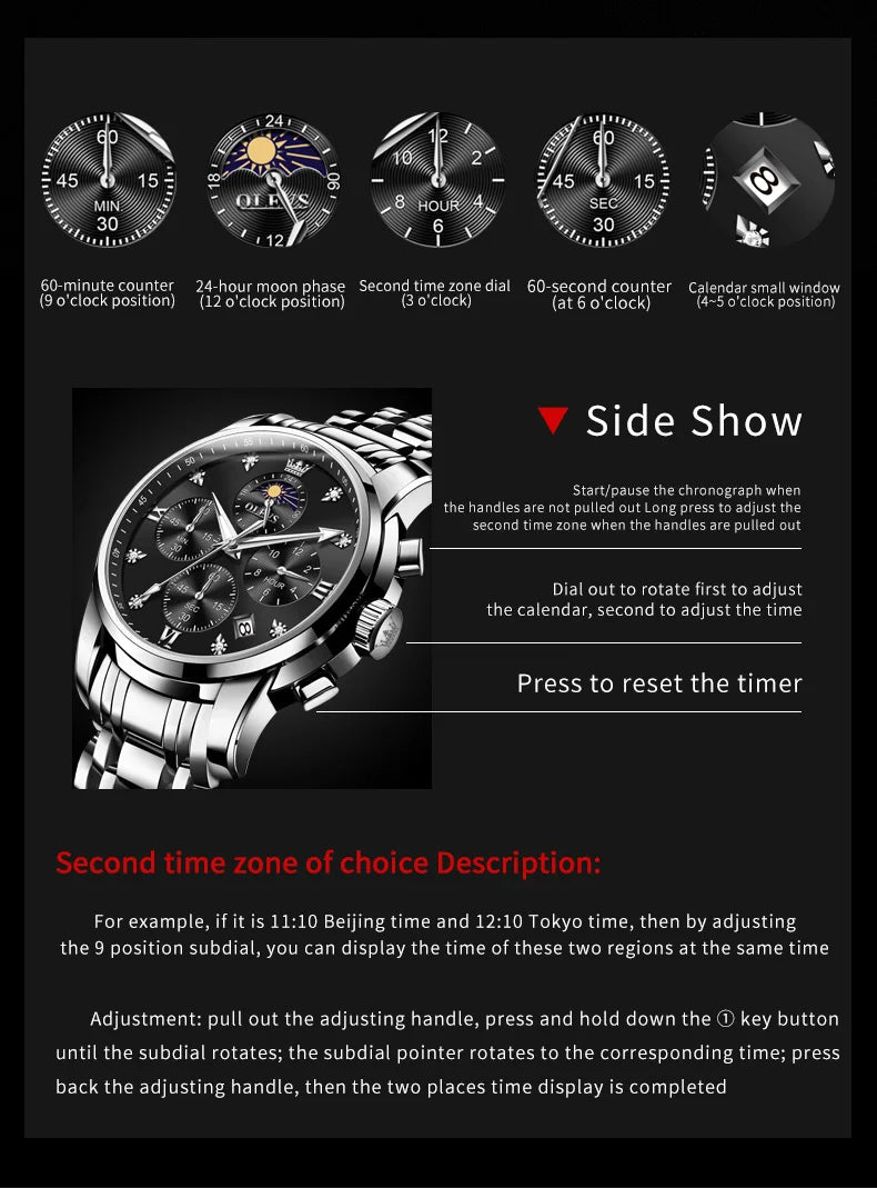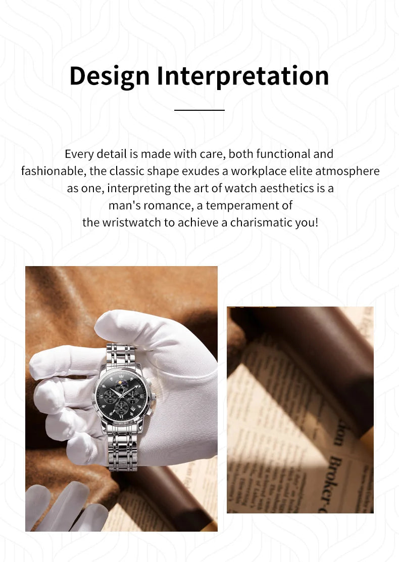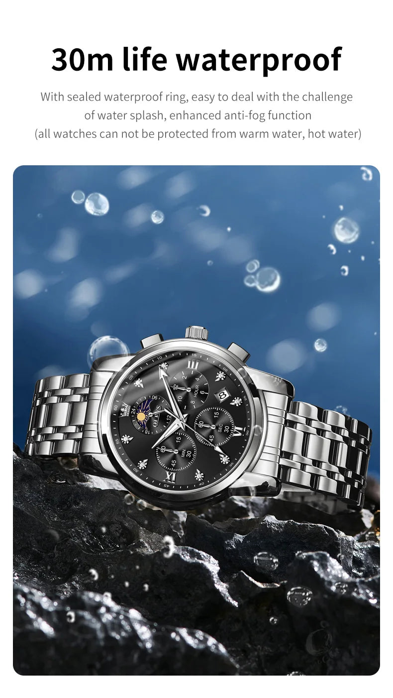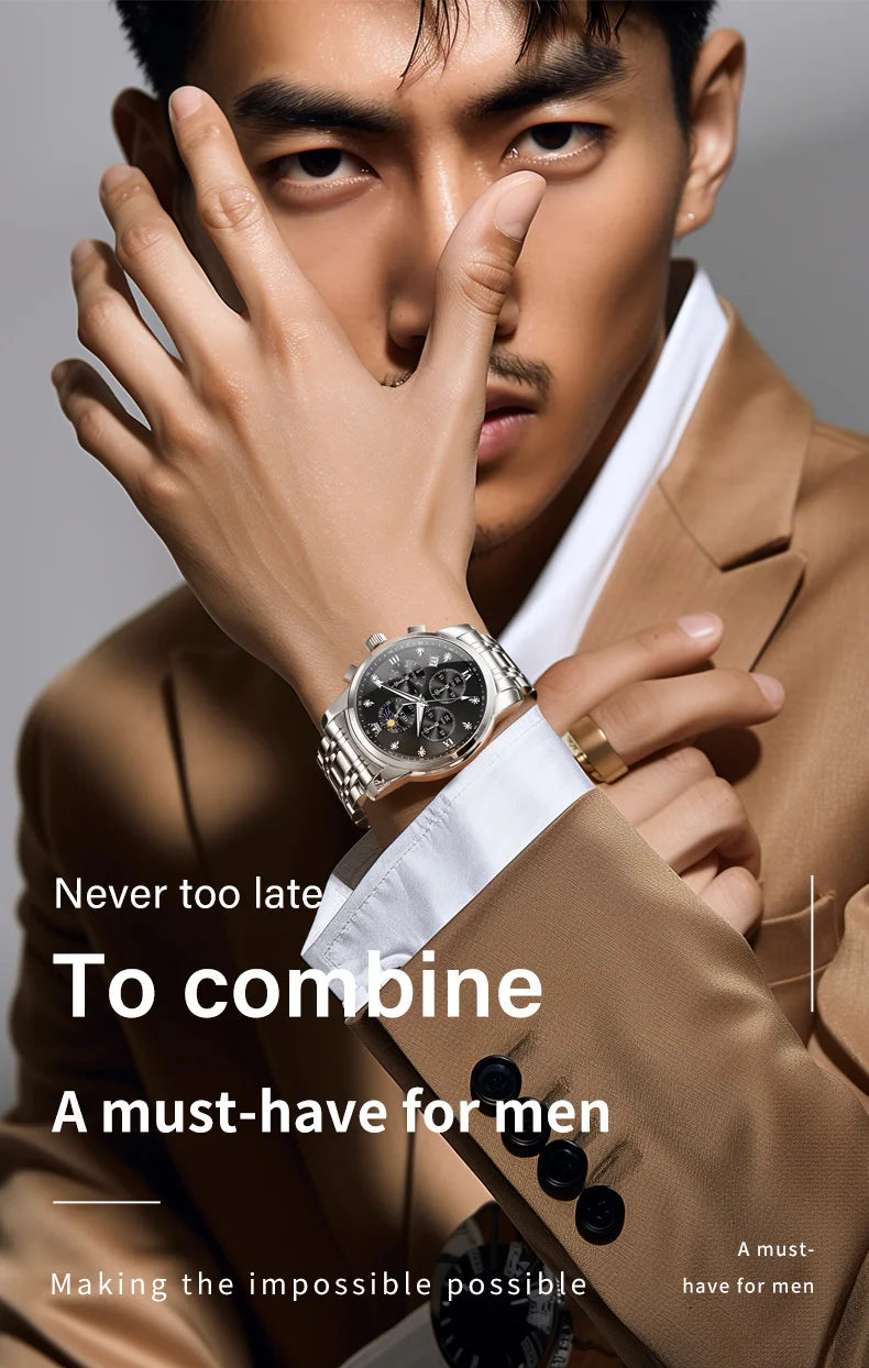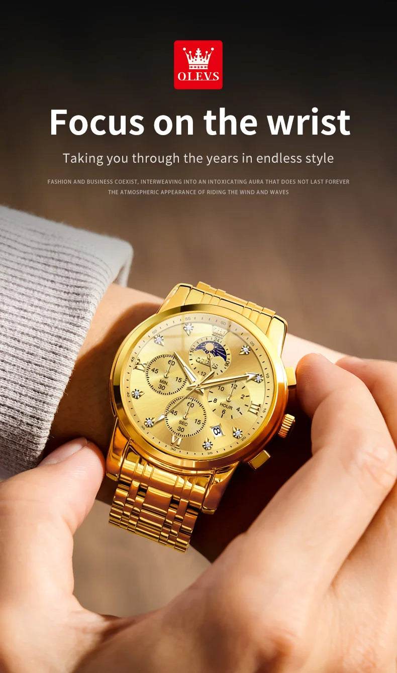 OLEVS 3655 är en mästerverk av klassisk klockkonst som kombinerar sofistikerad månfas-komplikation med professionell kronograf. Denna prestigefyllda herrur med automatisk datum, luminösa visare och vattentät konstruktion är skapad för män som uppskattar äkta kvalitet, avancerad funktionalitet och tidlös elegans.