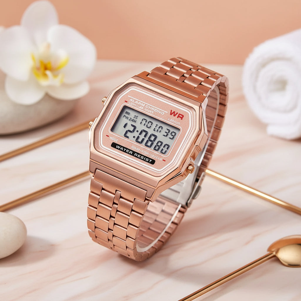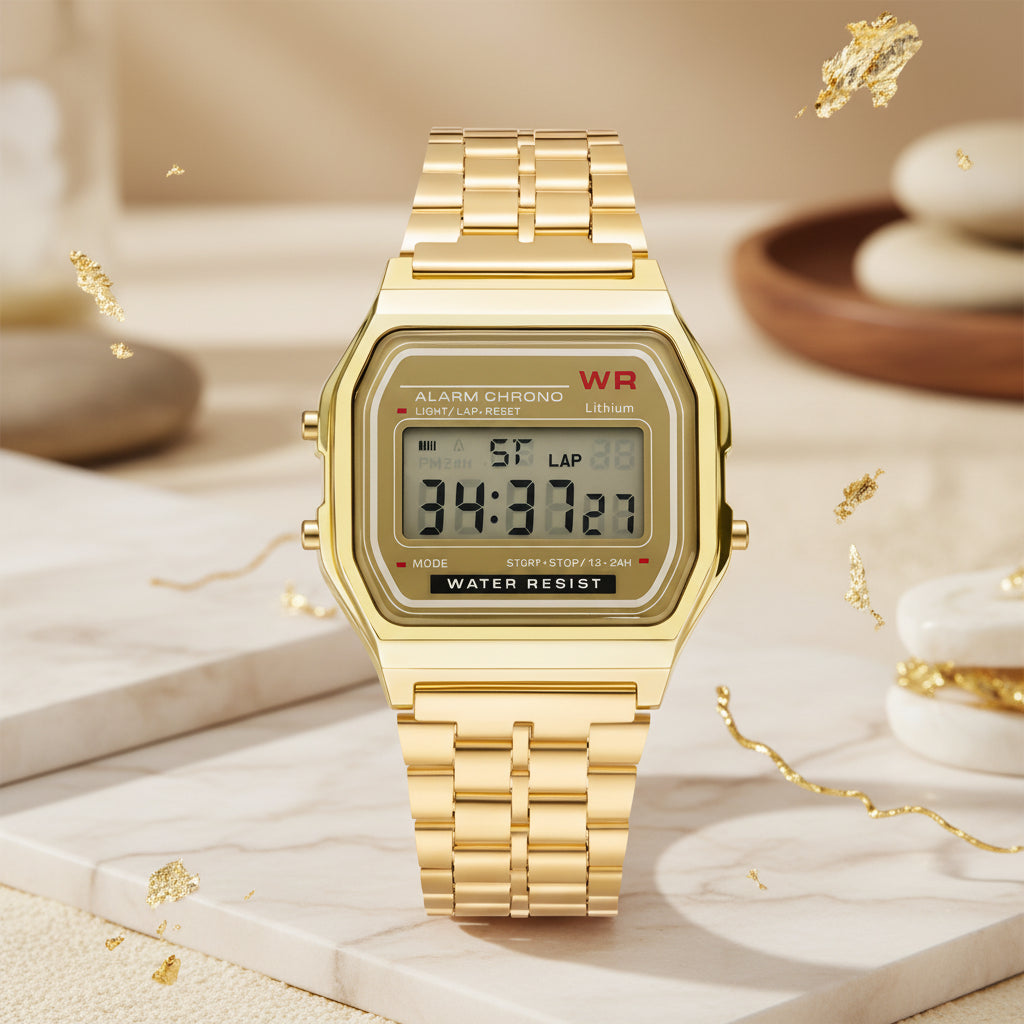 Denna tidlösa digitalklocka kombinerar praktisk funktionalitet med klassisk stil – en must-have i varje klocksamling.