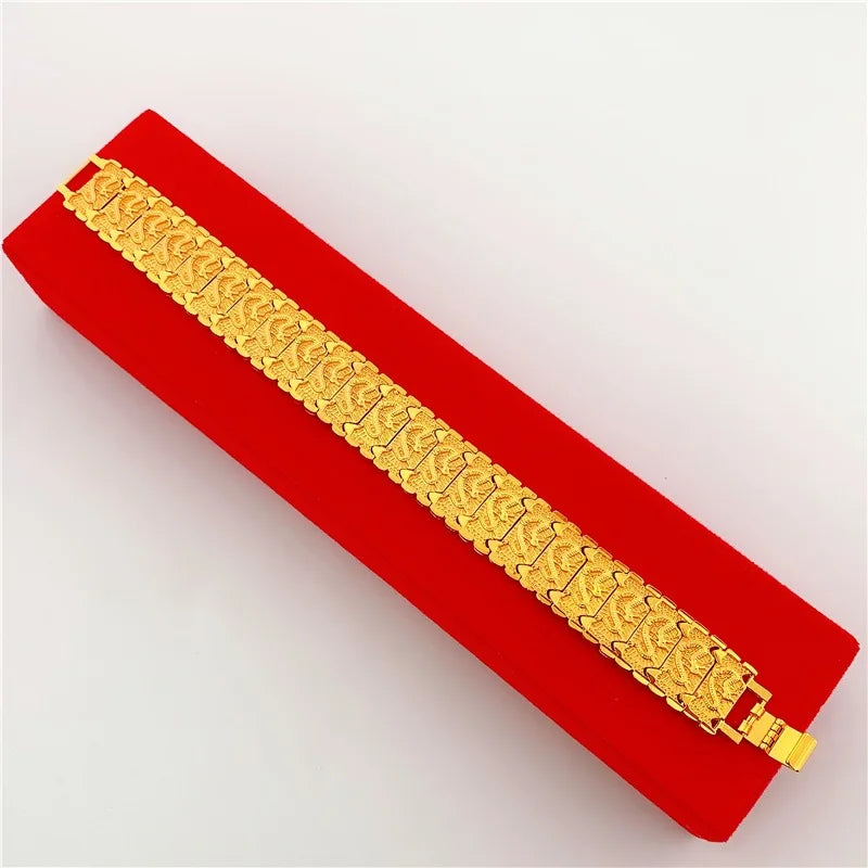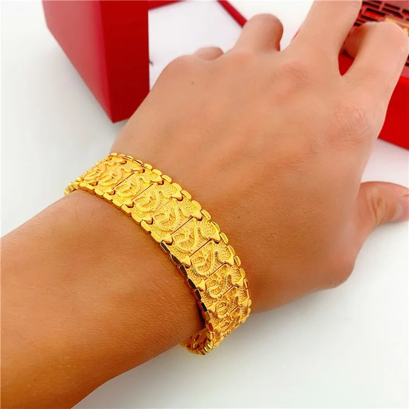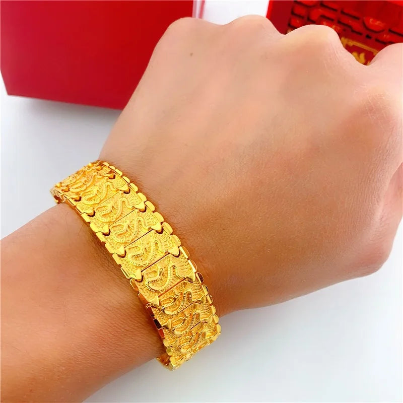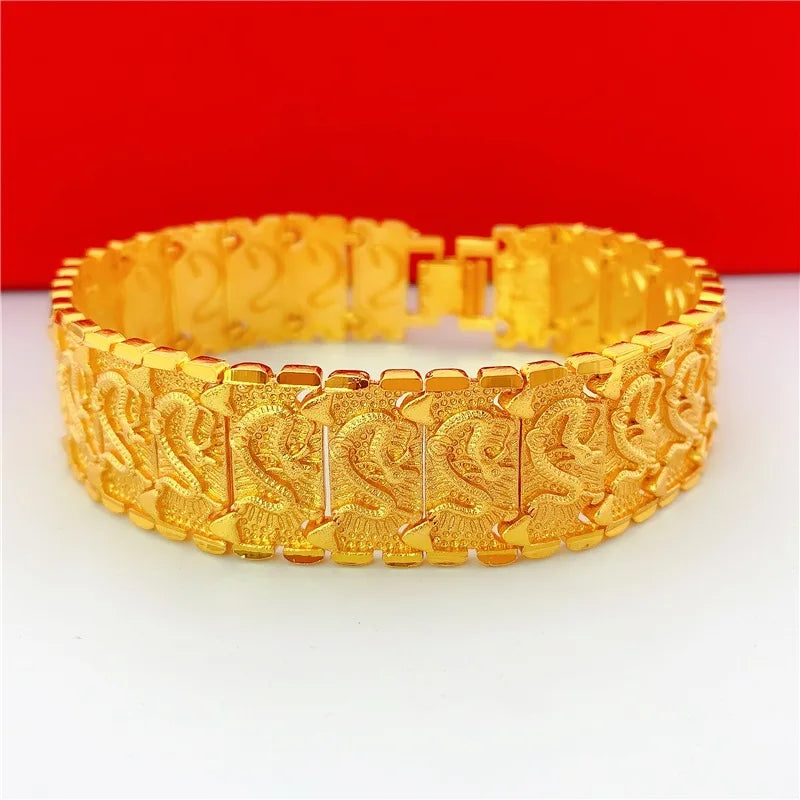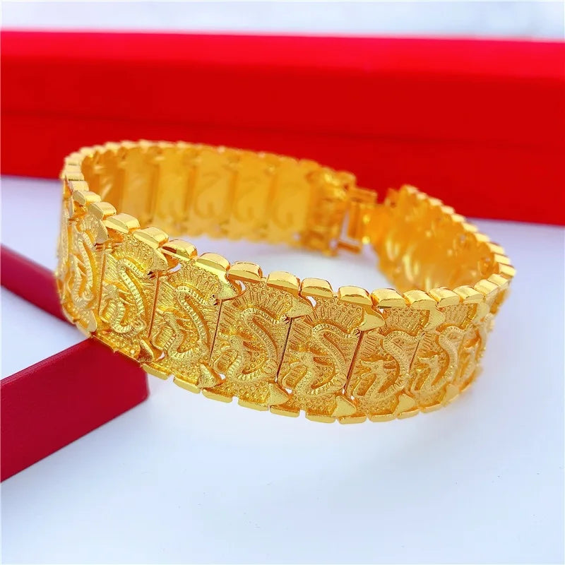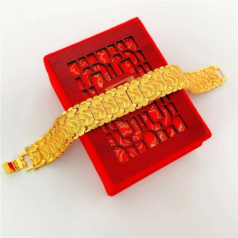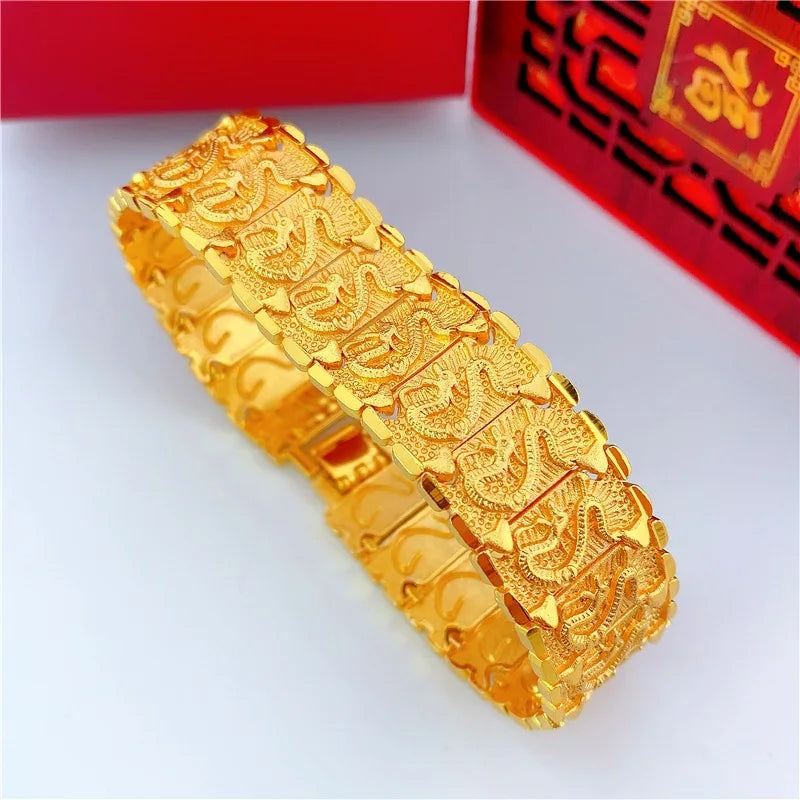 Ett exklusivt tjockt guldarmband i äkta 24K AU999 guld med detaljerad 3D drakdesign. Perfekt för par som vill matcha sin stil med ett kraftfullt och maskulint statement-smycke.