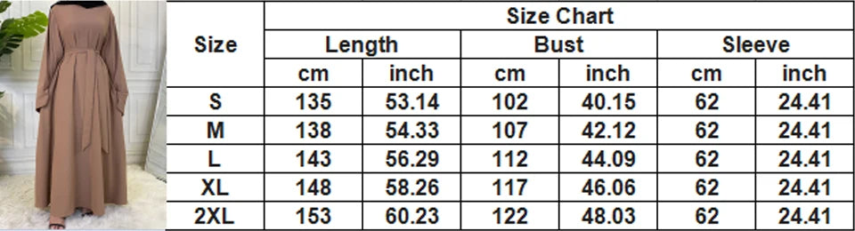 Elegant och lös abaya för muslimska kvinnor, perfekt för vardag och traditionella festivaler. Tillverkad i lätt polyester broadcloth med lång ärm, öppen söm och sashes-bälte. Passar för alla årstider och finns i flera storlekar från S till XXL.