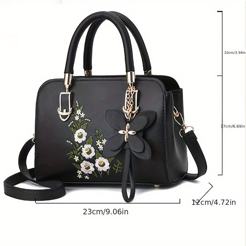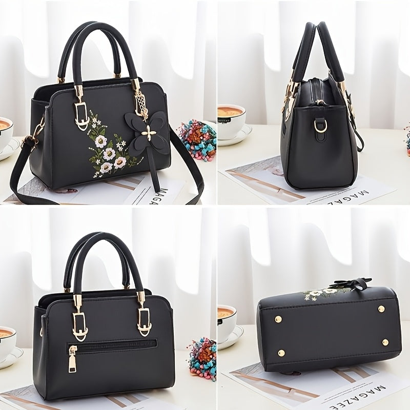 Elegant och rymlig handväska i syntetläder med blommig brodyr. Mjuk design med dragkedja, avtagbar rem och polyesterfoder – perfekt för vardag och arbete.